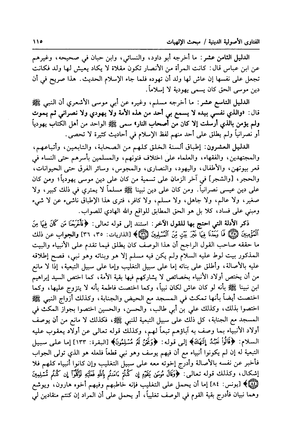 الدليل الثامن عشر : ما أخرجه أبو داود ، والنسائي ، وابن حبان في صحيحه ، وغيرهم عن ابن عباس قال : كانت المرأة من الأنصار تكون مقلاة لا يكاد يعيش لها ولد فكانت تجعل على نفسها إن عاش لها ولد أن تهوده فلما جاء الإسلام الحديث. هذا صريح في أن دين موسى الحق كان يسمى يهودية لا إسلاماً.