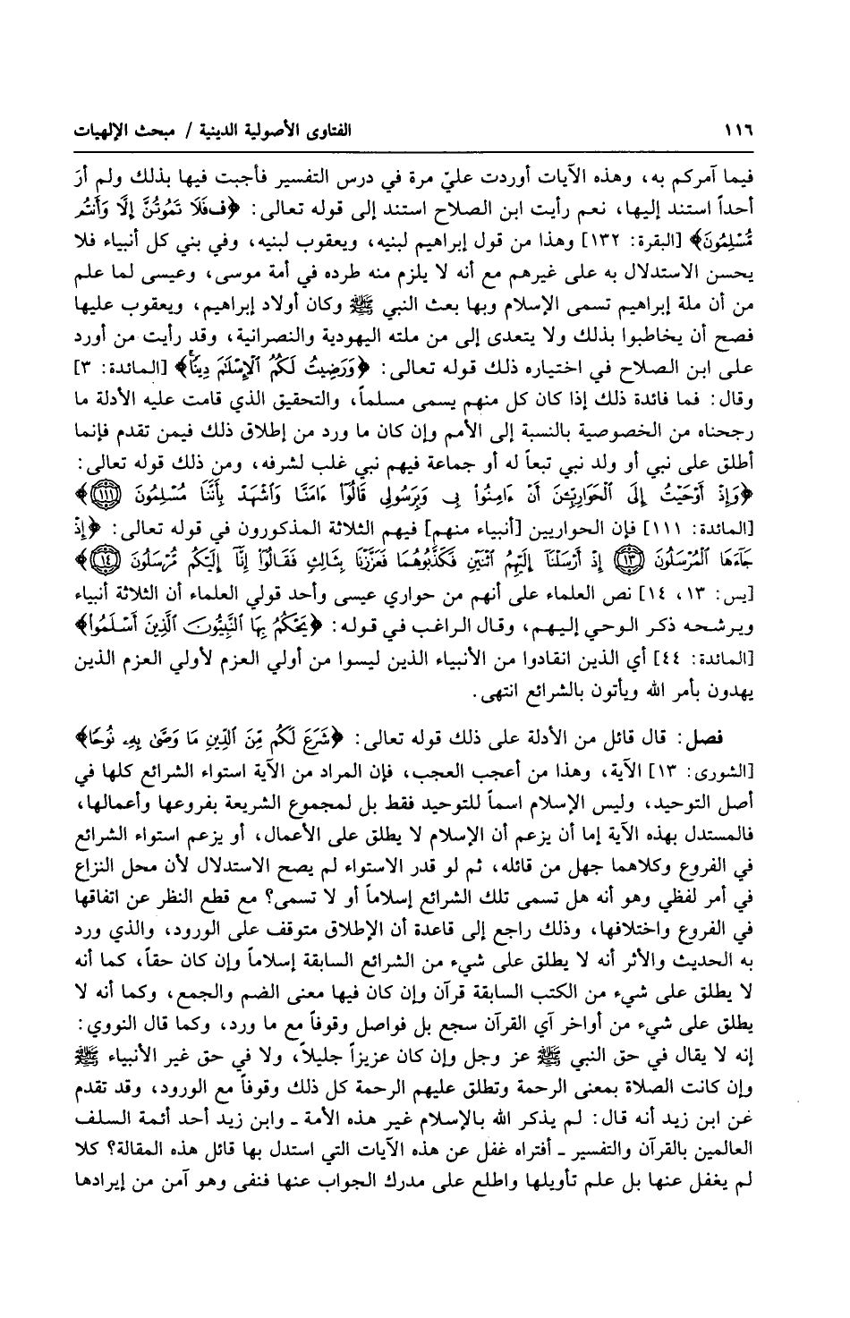 فصل : قال قائل من الأدلة على ذلك قوله تعالى : ) شرع لكم من الدين ما وصى به نوحاً ( الآية ، وهذا من أعجب العجب ، فإن المراد من الآية استواء الشرائع كلها في أصل التوحيد ، وليس الإسلام اسماً للتوحيد فقط بل لمجموع الشريعة بفروعها وأعمالها ، فالمستدل بهذه الآية إما أن يزعم أن الإسلام لا يطلق على الأعمال ، أو يزعم استواء الشرائع في الفروع وكلاهما جهل من قائله ، ثم لو قدر الاستواء لم يصح الاستدلال لأن محل النزاع في أمر لفظي وهو أنه هل تسمى تلك الشرائع إسلاماً أو لا تسمى ؟ مع قطع النظر عن اتفاقها في الفروع واختلافها ، وذلك راجع إلى قاعدة أن الإطلاق متوقف على الورود ، والذي ورد به الحديث والأثر أنه لا يطلق على شيء من الشرائع السابقة إسلاماً وإن كان حقاً ، كما أنه لا يطلق على شيء من الكتب السابقة قرآن وإن كان فيها معنى الضم والجمع ، وكما أنه لا يطلق على شيء من أواخر آي القرآن سجع بل فواصل وقوفاً مع ما ورد ، وكما قال النووي : أنه لا يقال في حق النبي صلى الله عليه وسلّم عز وجل وإن كان عزيزاً جليلاً ، ولا في حق غير الأنبياء صلى الله عليه وسلّم وإن كانت الصلاة بمعنى الرحمة وتطلق عليهم الرحمة كل ذلك وقوفاً مع الورود ، وقد تقدم عن ابن زيد أنه قال : لم يذكر الله بالإسلام غير هذه الأمة وابن زيد أحد أئمة السلف العالمين بالقرآن والتفسير أفتراه غفل عن هذه الآيات التي استدل بها قائل هذه المقالة ؟ كلا لم يغفل عنها بل علم تأويلها واطلع على مدرك الجواب عنها فنفى وهو آمن من إيرادها