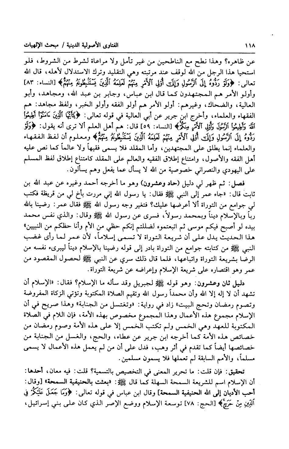 فصل : ثم ظهر لي دليل ( حاد وعشرون ) وهو ما أخرجه أحمد وغيره عن عبد الله بن ثابت قال : ( جاء عمر إلى النبي صلى الله عليه وسلّم فقال : يا رسول الله إني مررت بأخ لي من قريظة فكتب لي جوامع من التوراة ألا أعرضها عليك ؟ فتغير وجه رسول الله صلى الله عليه وسلّم فقال عمر : رضينا بالله رباً وبالإسلام ديناً وبمحمد رسولاً ، فسرى عن رسول الله صلى الله عليه وسلّم وقال : والذي نفس محمد بيده لو أصبح فيكم موسى ثم اتبعتموه لضللتم إنكم حظي من الأم وأنا حظكم من النبيين ) هذا الحديث يدل على أن شريعة التوراة لا تسمى إسلاماً ، لأن عمر لما رأى غضب النبي صلى الله عليه وسلّم من كتابته جوامع من التوراة بادر إلى قوله رضينا بالإسلام ديناً ليبرىء نفسه من الرضا بشريعة التوراة واتباعها ، فلما قال ذلك سري عن النبي صلى الله عليه وسلّم لحصول المقصود من عمر وهو اقتصاره على شريعة الإسلام وإعراضه عن شريعة التوراة.