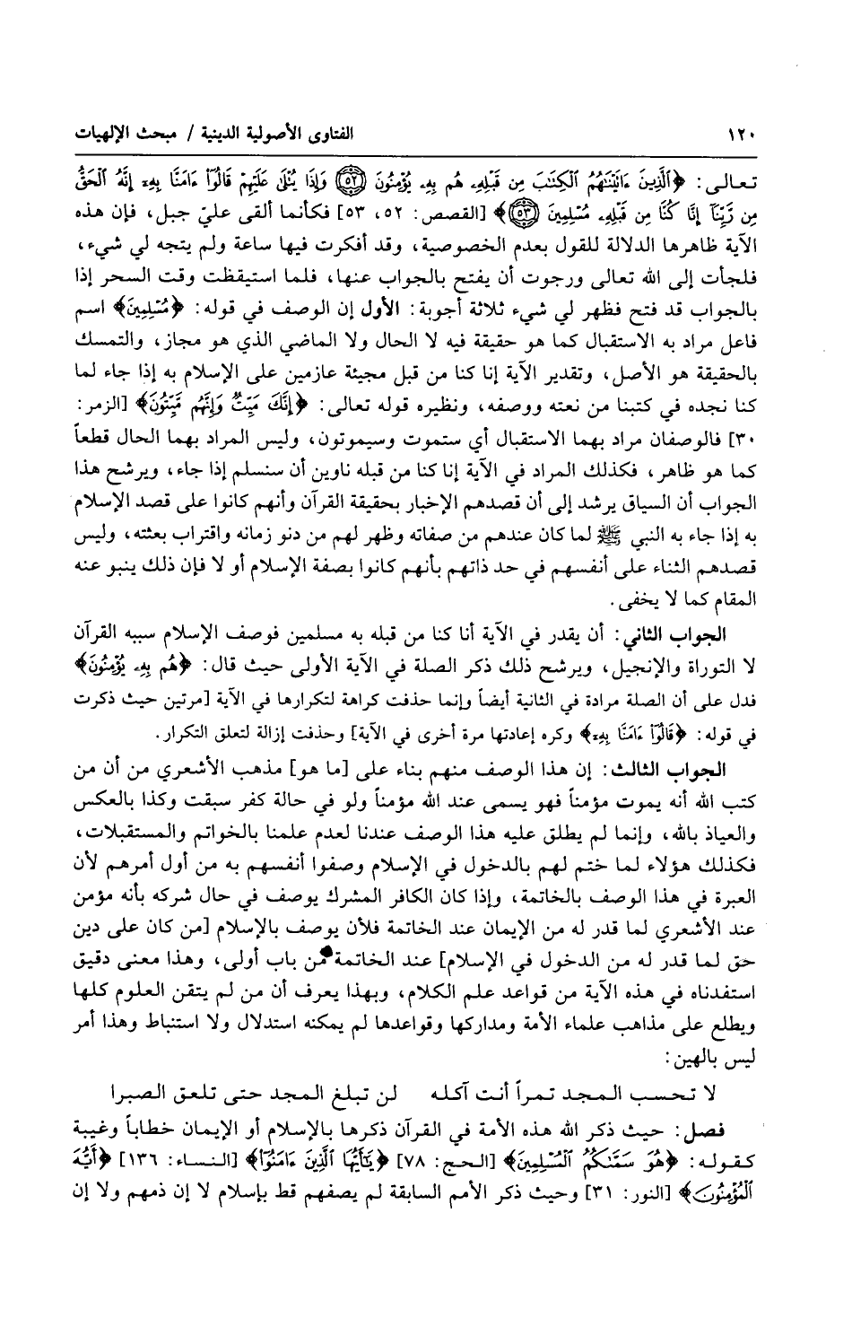 تعالى:) الذين آتيناهم الكتاب من قبله هم به يؤمنون وإذا يتلى عليهم قالوا آمنا به إنه الحق من ربنا إنا كنا من قبله مسلمين (فكأنما ألقى عليّ جبل، فإن هذه الآية ظاهرها الدلالة للقول بعدم الخصوصية، وقد أفكرت فيها ساعة ولم يتجه لي شيء، فلجأت إلى الله تعالى ورجوت أن يفتح بالجواب عنها، فلما استيقظت وقت السحر إذا بالجواب قد فتح فظهر لي شيء ثلاثة أجوبة: الأول إن الوصف في قوله:) مسلمين (إسم فاعل مراد به الاستقبال كما هو حقيقة فيه لا الحال ولا الماضي الذي هو مجاز، والتمسك بالحقيقة هو الأصل، وتقدير الآية إنا كنا من قبل مجيئة عازمين على الإسلام به إذا جاء لما كنا نجده في كتبنا من نعته ووصفه، ونظيره قوله تعالى:) إنك ميت وإنهم ميتون (فالوصفان مراد بهما الاستقبال أي ستموت وسيموتون، وليس المراد بهما الحال قطعاً كما هو ظاهر، فكذلك المراد في الآية إنا كنا من قبله ناوين أن سنسلم إذا جاء، ويرشح هذا الجواب أن السياق يرشد إلى أن قصدهم الإخبار بحقيقة القرآن وأنهم كانوا على قصد الإسلام به إذا جاء به النبي صلى الله عليه وسلّم لما كان عندهم من صفاته وظهر لهم من دنو زمانه واقتراب بعثته، وليس قصدهم الثناء على أنفسهم في حد ذاتهم بأنهم كانوا بصفة الإسلام أولا فإن ذلك ينبو عنه المقام كما لا يخفى.
