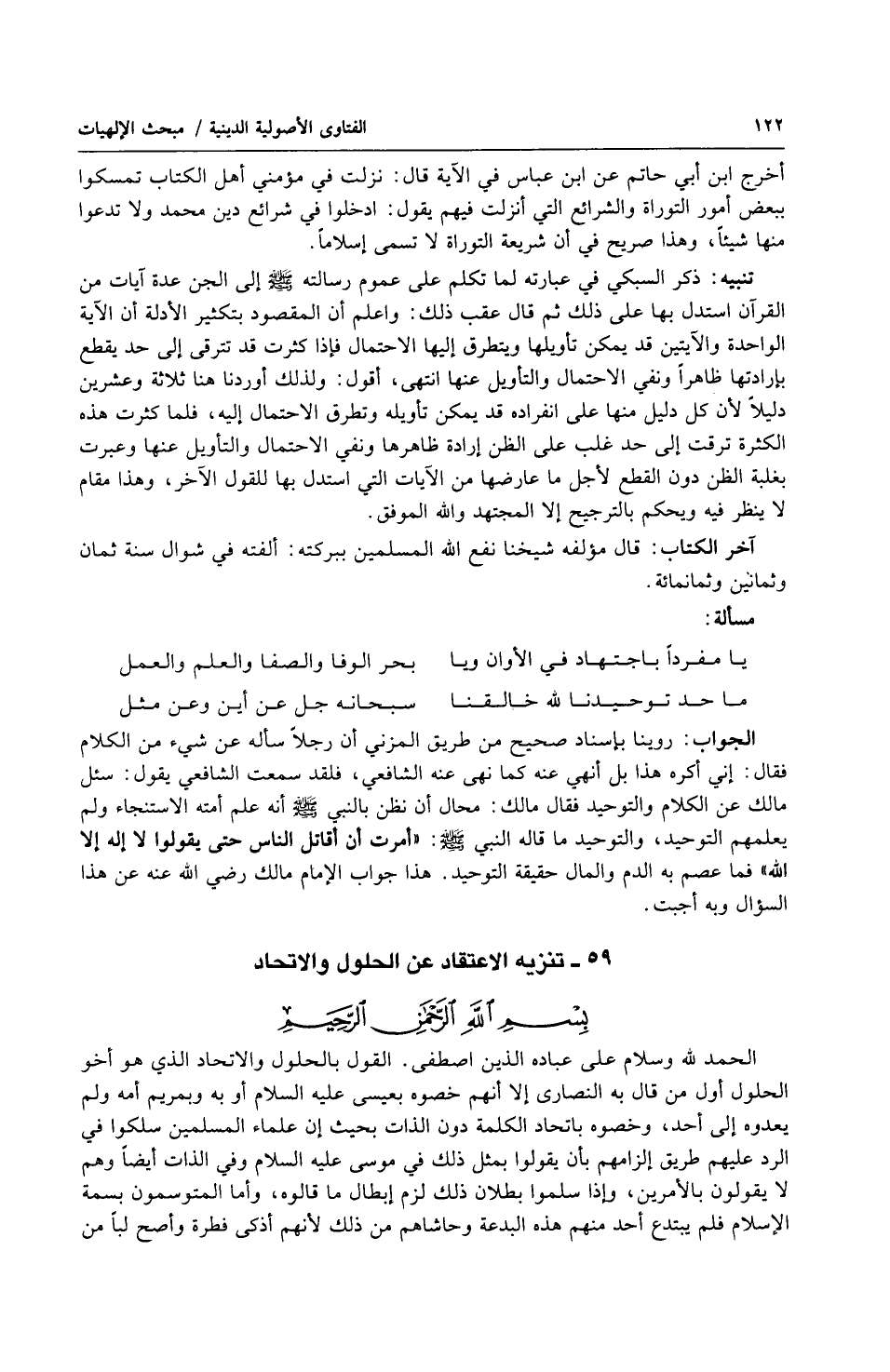 الجواب: روينا بإسناد صحيح من طريق المزني أن رجلاً سأله عن شيء من الكلام فقال: إني أكره هذا بل أنهي عنه كما نهى عنه الشافعي، فلقد سمعت الشافعي يقول: سئل مالك عن الكلام والتوحيد فقال مالك: محال أن نظن بالنبي صلى الله عليه وسلّم أنه علم أمته الاستنجاء ولم يعلمهم التوحيد، والتوحيد ما قاله النبي صلى الله عليه وسلّم: (أمرت أن أقاتل الناس حتى يقولوا لا إله إلا الله) فما عصم به الدم والمال حقيقة التوحيد. هذا جواب الإمام مالك رضي الله عنه عن هذا السؤال وبه أجبت.