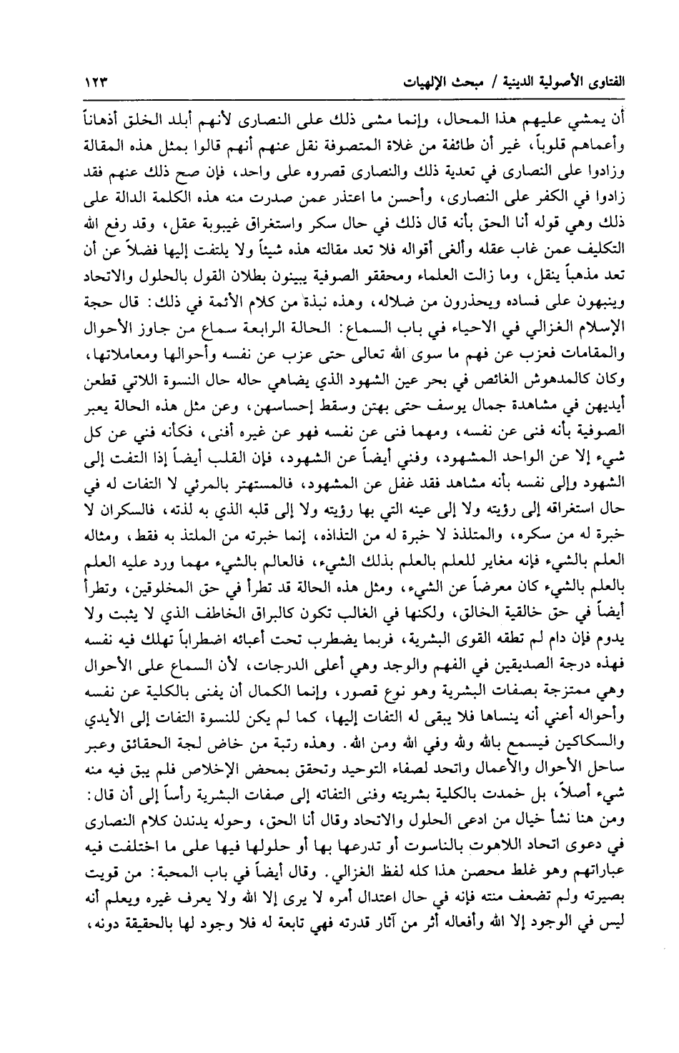 أن يمشي عليهم هذا المحال، وإنما مشى ذلك على النصارى لأنهم أبلد الخلق أذهاناً وأعماهم قلوباً، غير أن طائفة من غلاة المتصوفة نقل عنهم أنهم قالوا بمثل هذه المقالة وزادوا على النصارى في تعدية ذلك والنصارى قصروه على واحد، فإن صح ذلك عنهم فقد زادوا في الكفر على النصارى، وأحسن ما اعتذر عمن صدرت منه هذه الكلمة الدالة على ذلك وهي قوله أنا الحق بأنه قال ذلك في حال سكر واستغراق غيبوبة عقل، وقد رفع الله التكليف عمن غاب عقله وألغى أقواله فلا تعد مقالته هذه شيئاً ولا يلتفت إليها فضلاً عن أن تعد مذهباً ينقل، وما زالت العلماء ومحققو الصوفية يبينون بطلان القول بالحلول والاتحاد وينبهون على فساده ويحذرون من ضلاله، وهذه نبذة من كلام الأئمة في ذلك: قال حجة الإسلام الغزالي في الاحياء في باب السماع: الحالة الرابعة سماع من جاوز الأحوال والمقامات فعزب عن فهم ما سوى الله تعالى حتى عزب عن نفسه وأحوالها ومعاملاتها، وكان كالمدهوش الغائص في بحر عين الشهود الذي يضاهي حاله حال النسوة اللاتي قطعن أيديهن في مشاهدة جمال يوسف حتى بهتن وسقط إحساسهن، وعن مثل هذه الحالة يعبر الصوفية بأنه فنى عن نفسه، ومهما فنى عن نفسه فهو عن غيره أفنى، فكأنه فني عن كل شيء إلا عن الواحد المشهود، وفني أيضاً عن الشهود، فإن القلب أيضاً إذا التفت إلى الشهود وإلى نفسه بأنه مشاهد فقد غفل عن المشهود، فالمستهتر بالمرئي لا التفات له في حال استغراقه إلى رؤيته ولا إلى عينه التي بها رؤيته ولا إلى قلبه الذي به لذته، فالسكران لا خبرة له من سكره، والمتلذذ لا خبرة له من التذاذه، إنما خبرته من الملتذ به فقط، ومثاله العلم بالشيء فإنه مغاير للعلم بالعلم بذلك الشيء، فالعالم بالشيء مهما ورد عليه العلم بالعلم بالشيء كان معرضاً عن الشيء، ومثل هذه الحالة قد تطرأ في حق المخلوقين، وتطرأ أيضاً في حق خالقية الخالق، ولكنها في الغالب تكون كالبراق الخاطف الذي لا يثبت ولا يدوم فإن دام لم تطقه القوى البشرية، فربما يضطرب تحت أعبائه اضطراباً تهلك فيه نفسه فهذه درجة الصديقين في الفهم والوجد وهي أعلى الدرجات، لأن السماع على الأحوال وهي ممتزجة بصفات البشرية وهو نوع قصور، وإنما الكمال أن يفنى بالكلية عن نفسه وأحواله أعني أنه ينساها فلا يبقى له التفات إليها، كما لم يكن للنسوة التفات إلى الأيدي والسكاكين فيسمع بالله ولله وفي الله ومن الله. وهذه رتبة من خاض لجة الحقائق وعبر ساحل الأحوال والأعمال واتحد لصفاء التوحيد وتحقيق بمحض الإخلاص فلم يبق فيه منه شيء أصلاً، بل خمدت بالكلية بشريته وفنى إلتفاته إلى صفات البشرية رأساً إلى أن قال: ومن هنا نشأ خيال من ادعى الحلول والاتحاد وقال أنا الحق، وحوله يدندن كلام النصارى في دعوى اتحاد اللاهوت بالناسوت أو تدرعها بها أو حلولها فيها على ما اختلفت فيه عباراتهم وهو غلط محصن هذا كله لفظ الغزالي. وقال أيضاً في باب المحبة: من قويت بصيرته ولم تضعف منته فإنه في حال اعتدال أمره لا يرى إلا الله ولا يعرف غيره ويعلم أنه ليس في الوجود إلا الله وأفعاله أثر من آثار قدرته فهي تابعة له فلا وجود لها بالحقيقة دونه،