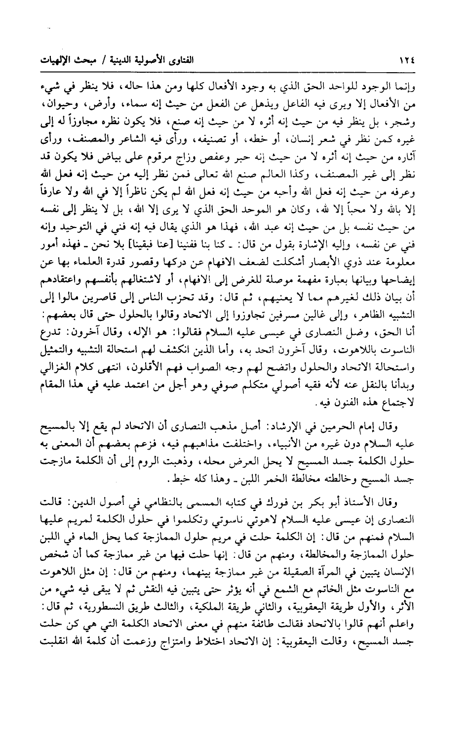 وإنما الوجود للواحد الحق الذي به وجود الأفعال كلها ومن هذا حاله ، فلا ينظر في شيء من الأفعال إلا ويرى فيه الفاعل ويذهل عن الفعل من حيث أنه سماء ، وأرض ، وحيوان ، وشجر ، بل ينظر فيه من حيث أنه أثره لا من حيث أنه صنع ، فلا يكون نظره مجاوزاً له إلى غيره كمن نظر في شعر إنسان ، أو خطه ، أو تصنيفه ، ورأى فيه الشاعر والمصنف ، ورأى آثاره من حيث أنه أثره لا من حيث أنه حبر وعفص وزاج مرقوم على بياض فلا يكون قد نظر إلى غير المصنف ، وكذا العالم صنع الله تعالى فمن نظر إليه من حيث أنه فعل الله وعرفه من حيث أنه فعل الله وأحبه من حيث أنه فعل الله لم يكن ناظراً إلا في الله ولا عارفاً إلا بالله ولا محباً إلا لله ، وكان هو الموحد الحق الذي لا يرى إلا الله ، بل لا ينظر إلى نفسه من حيث نفسه بل من حيث أنه عبد الله ، فهذا هو الذي يقال فيه أنه فنى في التوحيد وأنه فنى عن نفسه ، وإليه الإشارة بقول من قال : كنا بنا ففنينا [ عنا فبقينا ] بلا نحن فهذه أمور معلومة عند ذوي الأبصار أشكلت لضعف الافهام عن دركها وقصور قدرة العلماء بها عن إيضاحها وبيانها بعبارة مفهمة موصلة للغرض إلى الافهام ، أو لاشتغالهم بأنفسهم واعتقادهم أن بيان ذلك لغيرهم مما لا يعنيهم ، ثم قال : وقد تحزب الناس إلى قاصرين مالوا إلى التشبيه الظاهر ، وإلى غالين مسرفين تجاوزوا إلى الاتحاد وقالوا بالحلول حتى قال بعضهم : أنا الحق ، وضل النصارى في عيسى عليه السلام فقالوا : هو الإله ، وقال آخرون : تدرع الناسوت باللاهوت ، وقال آخرون اتحد به ، وأما الذين انكشف لهم استحالة التشبيه والتمثيل واستحالة الاتحاد والحلول واتضح لهم وجه الصواب فهم الأقلون ، انتهى كلام الغزالي وبدأنا بالنقل عنه لأنه فقيه أصولي متكلم صوفي وهو أجل من اعتمد عليه في هذا المقام لاجتماع هذه الفنون فيه.
