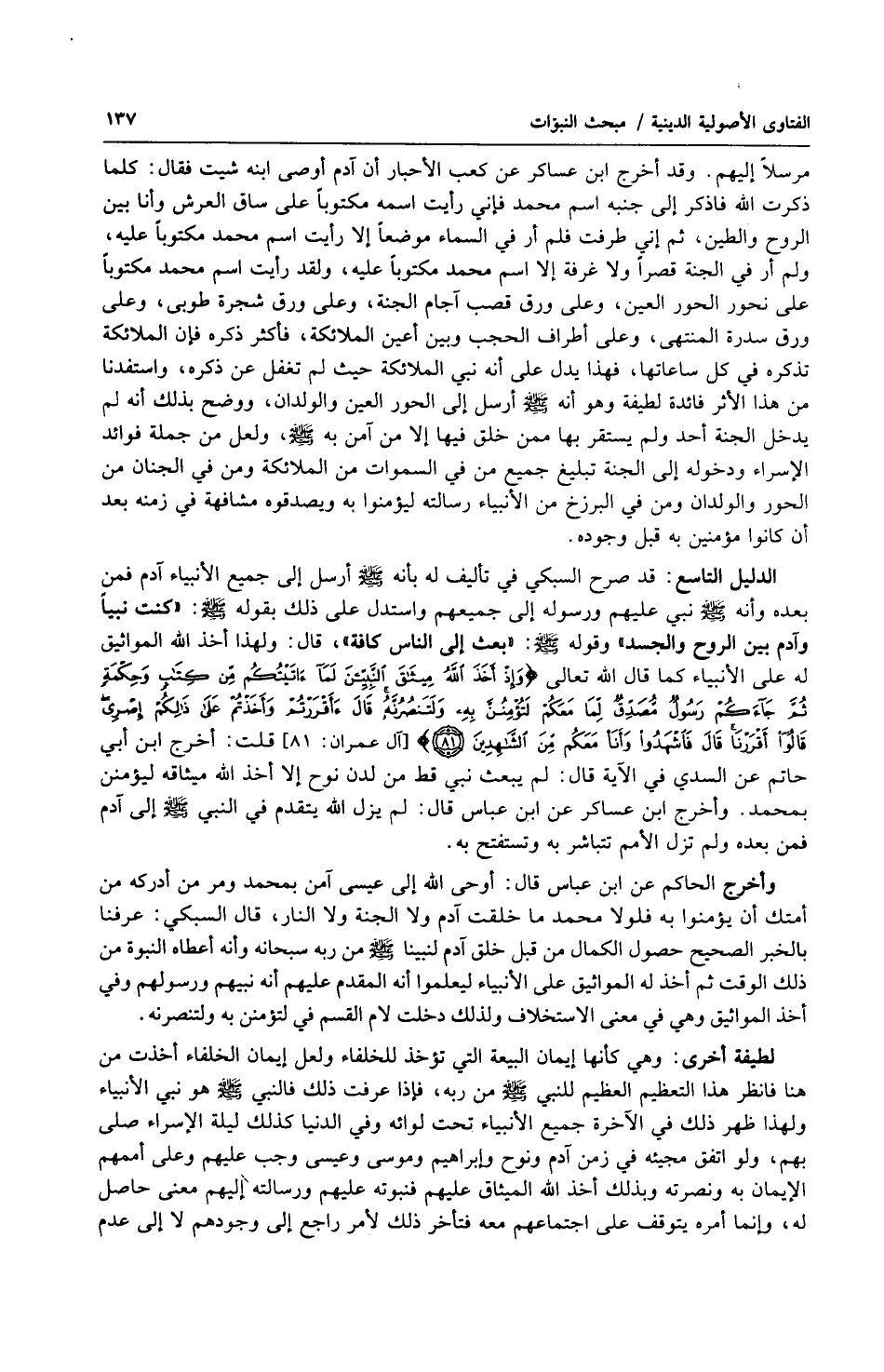 الدليل التاسع : قد صرح السبكي في تأليف له بأنه صلى الله عليه وسلّم أرسل إلى جميع الأنبياء آدم فمن بعده وأنه صلى الله عليه وسلّم نبي عليهم ورسوله إلى جميعهم واستدل على ذلك بقوله صلى الله عليه وسلّم : ( كنت نبياً وآدم بين الروح والجسد ) وقوله صلى الله عليه وسلّم : بعث إلى الناس كافة ، قال : ولهذا أخذ الله المواثيق له على الأنبياء كما قال الله تعالى ) وإذ أخذ الله ميثاق النبيين لما آتيتكم من كتاب وحكمة ثم جاءكم رسول مصدق لما معكم لتؤمنن به ولتنصرنه قال أأقرتم وأخذتم على ذلكم إصري قالوا أقررنا قال فاشهدوا وأنا معكم من الشاهدين ( قلت : أخرج ابن أبي حاتم عن السدي في الآية قال : لم يبعث نبي قط من لدن نوح إلا أخذ الله ميثاقه ليؤمنن بمحمد. وأخرج ابن عساكر عن ابن عباس قال : لم يزل الله يتقدم في النبي صلى الله عليه وسلّم إلى آدم فمن بعده ولم تزل الأمم تتباشر به وتستفتح به.
