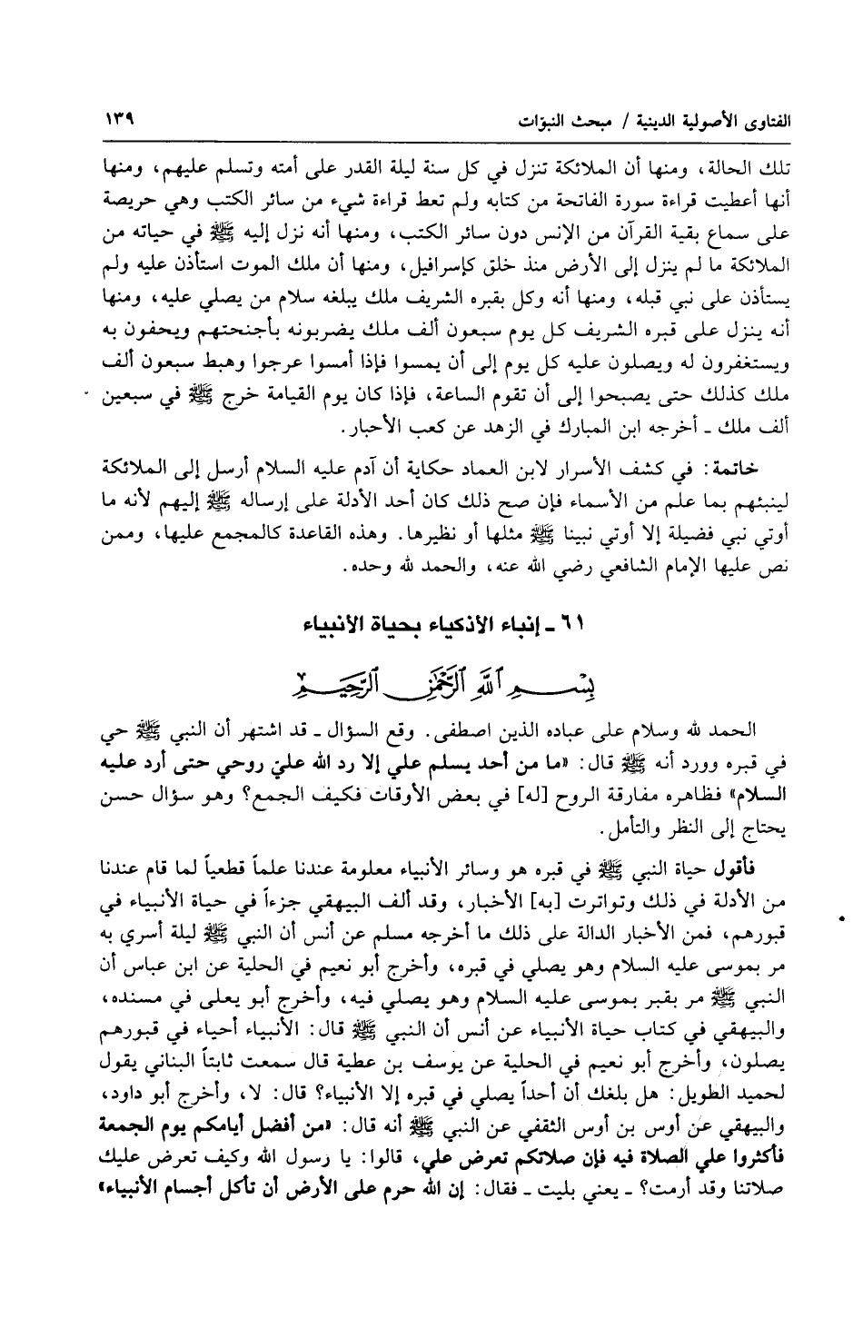 فأقول حياة النبي صلى الله عليه وسلّم في قبره هو وسائر الأنبياء معلومة عندنا علماً قطعياً لما قام عندنا من الأدلة في ذلك وتواترت [به] الأخبار، وقد ألف البيهقي جزءاً في حياة الأنبياء في قبورهم، فمن الأخبار الدالة على ذلك ما أخرجه مسلم عن أنس أن النبي صلى الله عليه وسلّم ليلة أسري به مر بموسى عليه السلام وهو يصلي في قبره، وأخرج أبو نعيم في الحلية عن ابن عباس أن النبي صلى الله عليه وسلّم مر بقبر بموسى عليه السلام وهو يصلي فيه، وأخرج أبو يعلى في مسنده، والبيهقي في كتاب حياة الأنبياء عن أنس أن النبي صلى الله عليه وسلّم قال: الأنبياء أحياء في قبورهم يصلون، وأخرج أبو نعيم في الحلية عن يوسف بن عطية قال سمعت ثابتاً البناني يقول لحميد الطويل: هل بلغك أن أحداً يصلي في قبره إلا الأنبياء؟ قال: لا، وأخرج أبو داود، والبيهقي عن أوس بن أوس الثقفي عن النبي صلى الله عليه وسلّم أنه قال: (من أفضل أيامكم يوم الجمعة فأكثروا علي الصلاة فيه فإن صلاتكم تعرض علي، قالوا: يا رسول الله وكيف تعرض عليك صلاتنا وقد أرمت؟ يعني بليت فقال: إن الله حرم على الأرض أن تأكل أجسام الأنبياء)