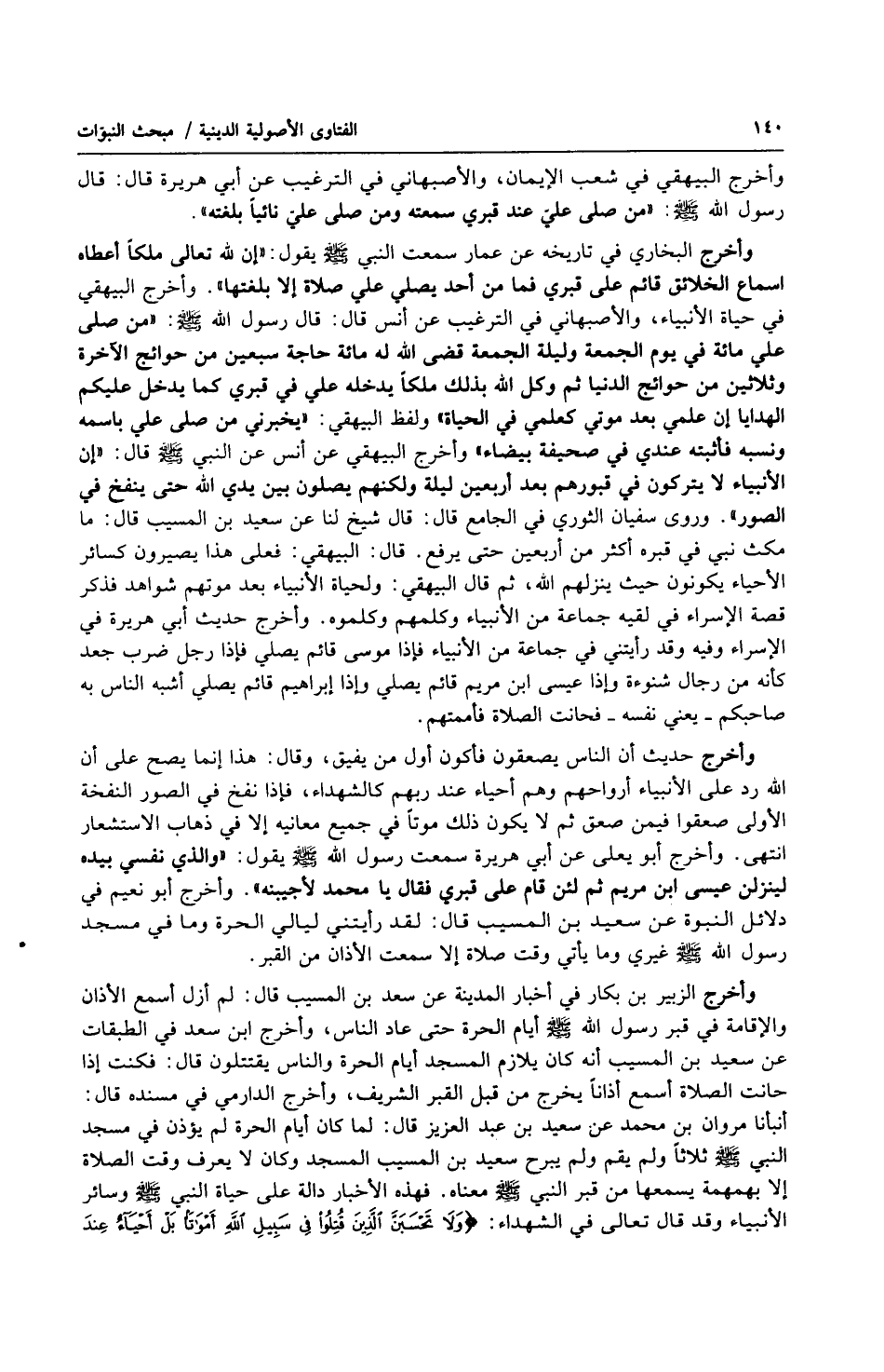 وأخرج البخاري في تاريخه عن عمار سمعت النبي صلى الله عليه وسلّم يقول : ( إن لله تعالى ملكاً أعطاه اسماع الخلائق قائم على قبري فما من أحد يصلي علي صلاة إلا بلغتها ). وأخرج البيهقي في حياة الأنبياء ، والأصبهاني في الترغيب عن أنس قال : قال رسول الله صلى الله عليه وسلّم : ( من صلى علي مائة في يوم الجمعة وليلة الجمعة قضى الله له مائة حاجة سبعين من حوائج الآخرة وثلاثين من حوائج الدنيا ثم وكل الله بذلك ملكاً يدخله علي في قبري كما يدخل عليكم الهدايا إن علمي بعد موتي كعلمي في الحياة ) ولفظ البيهقي : ( يخبرني من صلى علي باسمه ونسبه فأثبته عندي في صحيفة بيضاء ) وأخرج البيهقي عن أنس عن النبي صلى الله عليه وسلّم قال : ( إن الأنبياء لا يتركون في قبورهم بعد أربعين ليلة ولكنهم يصلون بين يدي الله حتى ينفخ في الصور ). وروى سفيان الثوري في الجامع قال : قال شيخ لنا عن سعيد بن المسيب قال : ما مكث نبي في قبره أكثر من أربعين حتى يرفع. قال : البيهقي : فعلى هذا يصيرون كسائر الأحياء يكونون حيث ينزلهم الله ، ثم قال البيهقي : ولحياة الأنبياء بعد موتهم شواهد فذكر قصة الإسراء في لقيه جماعة من الأنبياء وكلمهم وكلموه. وأخرج حديث أبي هريرة في الإسراء وفيه وقد رأيتني في جماعة من الأنبياء فإذا موسى قائم يصلي فإذا رجل ضرب جعد كأنه من رجال شنوءة وإذا عيسى ابن مريم قائم يصلي وإذا إبراهيم قائم يصلي أشبه الناس به صاحبكم يعني نفسه فحانت الصلاة فأممتهم.