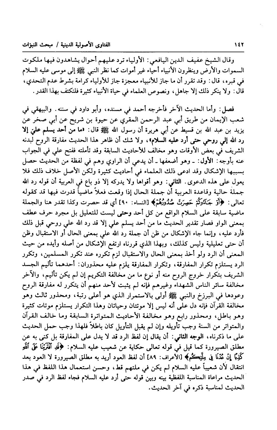 فصل : وأما الحديث الآخر فأخرجه أحمد في مسنده ، وأبو داود في سننه. والبيهقي في شعب الإيمان من طريق أبي عبد الرحمن المقري عن حيوة بن شريح عن أبي صخر عن يزيد بن عبد الله بن قسيط عن أبي هريرة أن رسول الله صلى الله عليه وسلّم قال : ما من أحد يسلم عليّ إلا رد الله إلي روحي حتى أرد عليه السلام ، ولا شك أن ظاهر هذا الحديث مفارقة الروح لبدنه الشريف في بعض الأوقات وهو مخالف للأحاديث السابقة وقد تأملته ففتح علي في الجواب عنه بأوجه : الأول : وهو أضعفها أن يدعي أن الراوي وهم في لفظة من الحديث حصل بسببها الإشكال وقد ادعى ذلك العلماء في أحاديث كثيرة ولكن الأصل خلاف ذلك فلا يعول على هذه الدعوى. الثاني : وهو أقواها ولا يدركه إلا ذو باع في العربية أن قوله رد الله جملة حالية وقاعدة العربية أن جملة الجال إذا وقعت فعلاً ماضياً قدرت فيها قد كقوله تعالى : ) أو جاءُوكم حصرت صدورهم ( أي قد حصرت وكذا تقدر هنا والجملة ماضية سابقة على السلام الواقع من كل أحد وحتى ليست للتعليل بل مجرد حرف عطف بمعنى الواو فصار تقدير الحديث ما من أحد يسلم علي إلا قد رد الله علي روحي قبل ذلك فأرد عليه ، وإنما جاء الإشكال من ظن أن جملة رد الله علي بمعنى الحال أو الاستقبال وظن أن حتى تعليلية وليس كذلك ، وبهذا الذي قررناه ارتفع الإشكال من أصله وأيده من حيث المعنى أن الرد ولو أخذ بمعنى الحال والاستقبال لزم تكرره عند تكرر المسلمين ، وتكرر الرد يستلزم تكرار المفارقة ، وتكرار المفارقة يلزم عليه محذوران : أحدهما تأليم الجسد الشريف بتكرار خروج الروح منه أو نوع ما من مخالفة التكريم إن لم يكن تأليم ، والآخر مخالفة سائر الناس الشهداء وغيرهم فإنه لم يثبت لأحد منهم أن يتكرر له مفارقة الروح وعودها في البرزخ والنبي صلى الله عليه وسلّم أولى بالاستمرار الذي هو أعلى رتبة ، ومحذور ثالث وهو مخالفة القرآن فإنه دل على أنه ليس إلا موتتان وحياتان وهذا التكرار يستلزم موتات كثيرة وهو باطل ، ومحذور رابع وهو مخالفة الأحاديث المتواتر السابقة وما خالف القرآن والمتواترة من السنة وجب تأويله وإن لم يقبل التأويل كان باطلاً فلهذا وجب حمل الحديث على ما ذكرناه ، الوجه الثاني : أن يقال أن لفظ الرد قد لا يدل على المفارقة بل كنى به عن مطلق الصيرورة كما قيل في قوله تعالى حكاية عن شعيب عليه السلام : ) قد افترينا على الله كذباً إن عدنا في ملتكم ( أن لفظ العود أريد به مطلق الصيرورة لا العود بعد انتقال لأن شعيباً عليه السلام لم يكن في ملتهم قط ، وحسن استعمال هذا اللفظ في هذا الحديث مراعاة المناسبة اللفظية بينه وبين قوله حتى أرد عليه السلام فجاء لفظ الرد في صدر الحديث لمناسبة ذكره في آخر الحديث