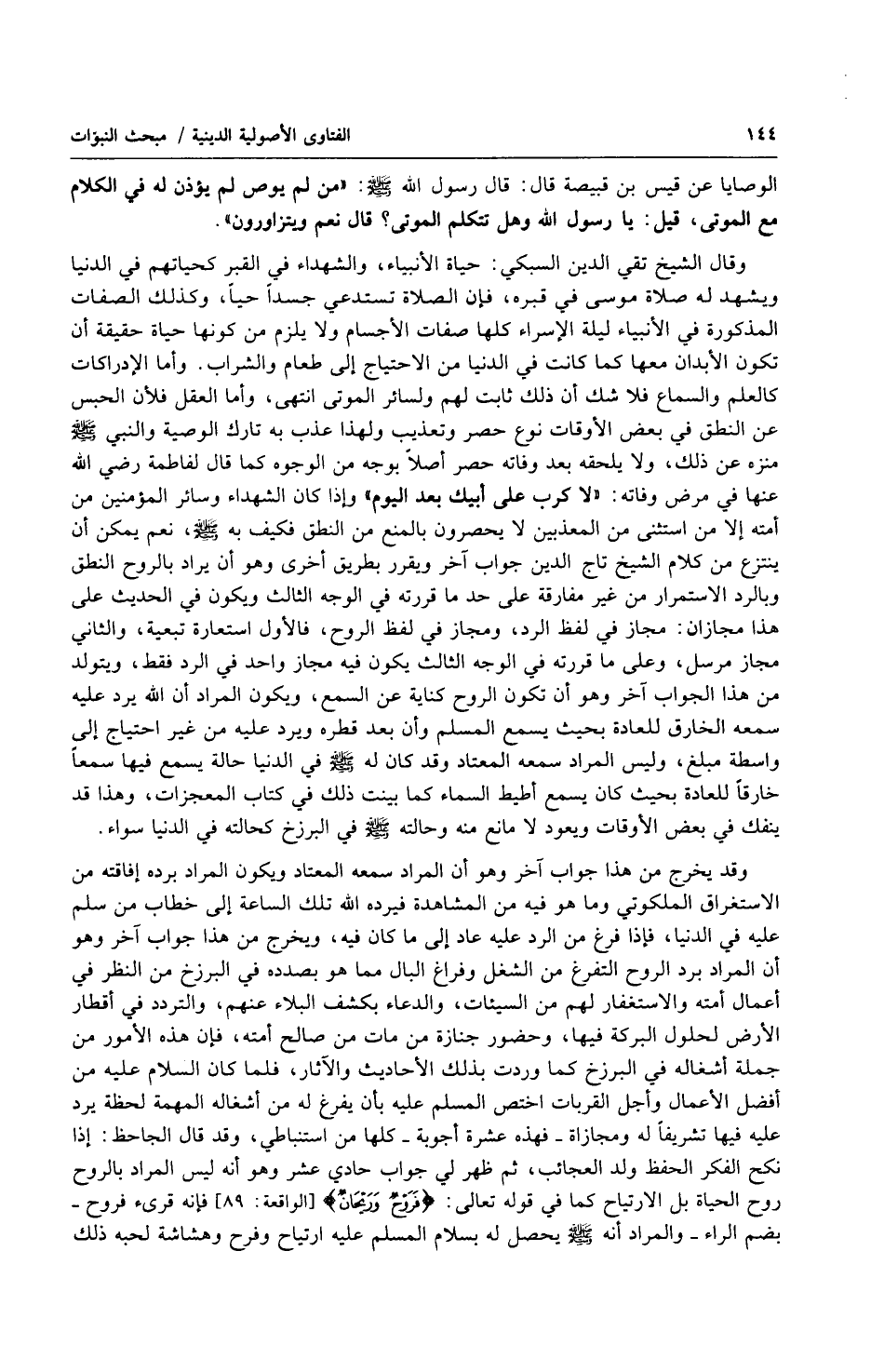 وقال الشيخ تقي الدين السبكي: حياة الأنبياء، والشهداء في القبر كحياتهم في الدنيا ويشهد له صلاة موسى في قبره، فإن الصلاة تستدعي جسداً حياً، وكذلك الصفات المذكورة في الأنبياء ليلة الإسراء كلها صفات الأجسام ولا يلزم من كونها حياة حقيقة أن تكون الأبدان معها كما كانت في الدنيا من الاحتياج إلى طعام والشراب. وأما الإدراكات كالعلم والسماع فلا شك أن ذلك ثابت لهم ولسائر الموتى انتهى، وأما العقل فلأن الحبس عن النطق في بعض الأوقات نوع حصر وتعذيب ولهذا عذب به تارك الوصية والنبي صلى الله عليه وسلّم منزه عن ذلك، ولا يلحقه بعد وفاته حصر أصلاً بوجه من الوجوه كما قال لفاطمة رضي الله عنها في مرض وفاته: (لا كرب على أبيك بعد اليوم) وإذا كان الشهداء وسائر المؤمنين من أمته إلا من استثنى من المعذبين لا يحصرون بالمنع من النطق فكيف به صلى الله عليه وسلّم، نعم يمكن أن ينتزع من كلام الشيخ تاج الدين جواب آخر ويقرر بطريق أخرى وهو أن يراد بالروح النطق وبالرد الاستمرار من غير مفارقة على حد ما قررته في الوجه الثالث ويكون في الحديث على هذا مجازان: مجاز في لفظ الرد، ومجاز في لفظ الروح، فالأول استعارة تبعية، والثاني مجاز مرسل، وعلى ما قررته في الوجه الثالث يكون فيه مجاز واحد في الرد فقط، ويتولد من هذا الجواب آخر وهو أن تكون الروح كتابة عن السمع، ويكون المراد أن الله يرد عليه سمعه الخارق للعادة بحيث يسمع المسلم وأن بعد قطره ويرد عليه من غير احتياج إلى واسطة مبلغ، وليس المراد سمعه المعتاد وقد كان له صلى الله عليه وسلّم في الدنيا حالة يسمع فيها سمعاً خارقاً للعادة بحيث كان يسمع أطيط السماء كما بينت ذلك في كتاب المعجزات، وهذا قد ينفك في بعض الأوقات ويعود لا مانع منه وحالته صلى الله عليه وسلّم في البرزخ كحالته في الدنيا سواء.