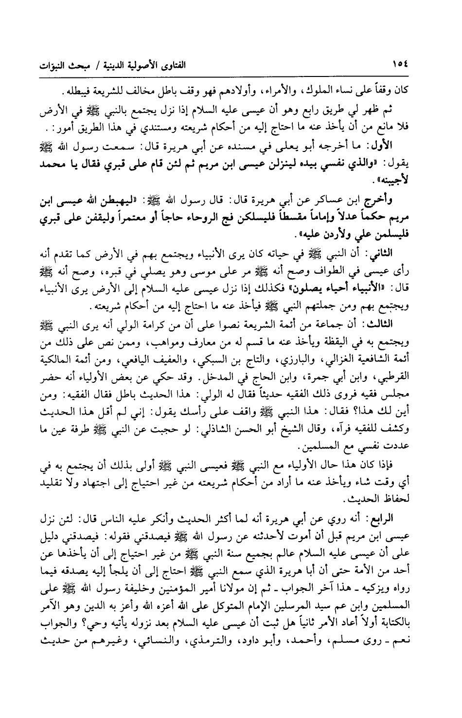 ثم ظهر لي طريق رابع وهو أن عيسى عليه السلام إذا نزل يجتمع بالنبي صلى الله عليه وسلّم في الأرض فلا مانع من أن يأخذ عنه ما احتاج إليه من أحكام شريعته ومستندي في هذا الطريق أمور :.
