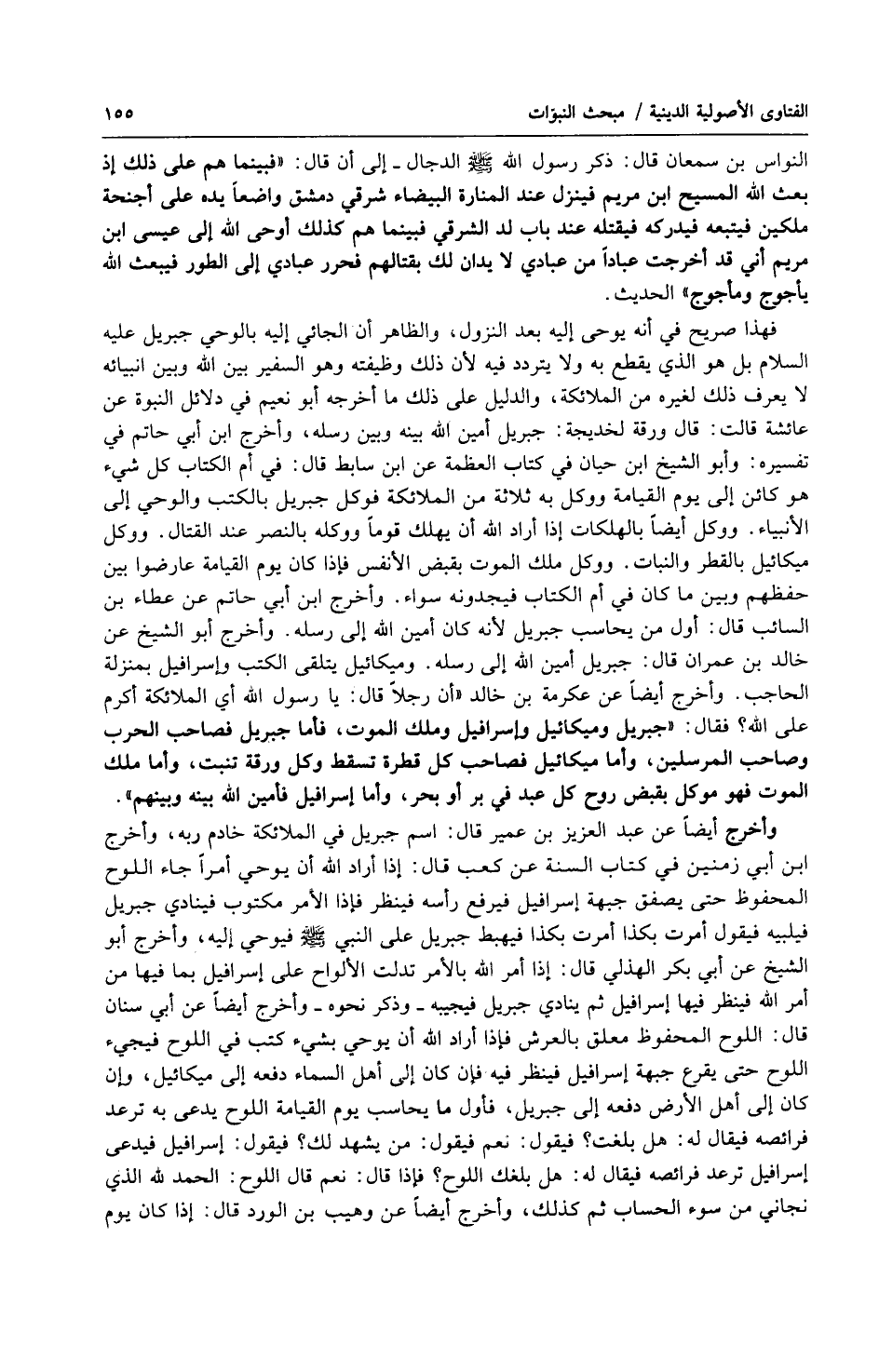 فهذا صريح في أنه يوحى إليه بعد النزول، والظاهر أن الجائي إليه بالوحي جبريل عليه السلام بل هو الذي يقطع به ولا يتردد فيه لأن ذلك وظيفته وهو السفير بين الله وبين انبيائه لا يعرف ذلك لغيره من الملائكة، والدليل على ذلك ما أخرجه أبو نعيم في دلائل النبوة عن عائشة قالت: قال ورقة لخديجة: جبريل أمين الله بينه وبين رسله، وأخرج ابن أبي حاتم في تفسيره: وأبو الشيخ ابن حيان في كتاب العظمة عن ابن سابط قال: في أم الكتاب كل شيء هو كائن إلى يوم القيامة ووكل به ثلاثة من الملائكة فوكل جبريل بالكتب والوحي إلى الأنبياء. ووكل أيضاً بالهلكات إذا أراد الله أن يهلك قوماً ووكله بالنصر عند القتال. ووكل ميكائيل بالقطر والنبات. ووكل ملك الموت بقبض الأنفس فإذا كان يوم القيامة عارضوا بين حفظهم وبين ما كان في أم الكتاب فيجدونه سواء. وأخرج ابن أبي حاتم عن عطاء بن السائب قال: أول من يحاسب جبريل لأنه كان أمين الله إلى رسله. وأخرج أبو الشيخ عن خالد بن عمران قال: جبريل أمين الله إلى رسله. وميكائيل يتلقى الكتب وإسرافيل بمنزلة الحاجب. وأخرج أيضاً عن عكرمة بن خالد (أن رجلاً قال: يا رسول الله أي الملائكة أكرم على الله؟ فقال: (جبريل وميكائيل وإسرافيل وملك الموت، فأما جبريل فصاحب الحرب وصاحب المرسلين، وأما ميكائيل فصاحب كل قطرة تسقط وكل ورقة تنبت، وأما ملك الموت فهو موكل بقبض روح كل عبد في بر أو بحر، وأما إسرافيل فأمين الله بينه وبينهم).