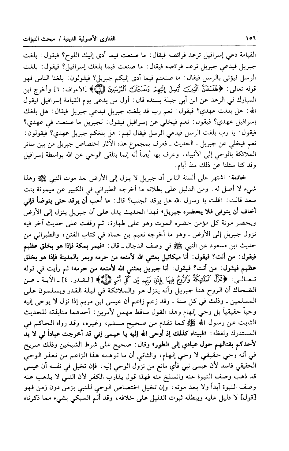 خاتمة: اشتهر على ألسنة الناس أن جبريل لا ينزل إلى الأرض بعد موت النبي صلى الله عليه وسلّم وهذا شيء لا أصل له. ومن الدليل على بطلانه ما أخرجه الطبراني في الكبير عن ميمونة بنت سعد قالت: (قلت يا رسول الله هل يرقد الجنب؟ قال: ما أحب أن يرقد حتى يتوضأ فإني أخاف أن يتوفى فلا يحضره جبريل) فهذا الحديث يدل على أن جبريل ينزل إلى الأرض ويحضر موتة كل مؤمن حضره الموت وهو على طهارة، ثم وقفت على حديث آخر فيه نزول جبريل إلى الأرض وهو ما أخرجه نعيم بن حماد في كتاب الفتن، والطبراني من حديث ابن مسعود عن النبي صلى الله عليه وسلّم في وصف الدجال قال: (فيمر بمكة فإذا هو بخلق عظيم فيقول: من أنت؟ فيقول: أنا ميكائيل بعثني الله لأمنعه من حرمه ويمر بالمدينة فإذا هو بخلق عظيم فيقول: من أنت؟ فيقول: أنا جبريل بعثني الله لأمنعه من حرمه) ثم رأيت في قوله تعالى:) تنزل الملائكة والروح فيها بإذن ربهم (الآية عن الضحاك أن الروح هنا جبريل وأنه ينزل هو والملائكة في ليلة القدر ويسلمون على المسلمين وذلك في كل سنة وقد زعم زاعم أن عيسى ابن مريم إذا نزل لا يوحى إليه وحياً حقيقياً بل وحي إلهام وهذا القول ساقط مهمل لأمرين: أحدهما منابذته للحديث الثابت عن رسول الله صلى الله عليه وسلّم كما تقدم من صحيح مسلم، وغيره، وقد رواه الحاكم في المستدرك ولفظه: (فبيناه كذلك إذ أوحى الله إليه يا عيسى إني قد أخرجت عباداً لي لا يد لأحدكم بقتالهم حول عبادي إلى الطور) وقال: صحيح على شرط الشيخين وذلك صريح في أنه وحي حقيقي لا وحي إلهام، والثاني أن ما توهمه هذا الزاعم من تعذر الوحي الحقيقي فاسد لأن عيسى نبي فأي مانع من نزول الوحي إليه، فإن تخيل في نفسه أن عيسى قد ذهب وصف النبوة عنه وانسلخ منه فهذا قول يقارب الكفر لأن النبي لا يذهب عنه وصف النبوة أبداً ولا بعد موته، وإن تخيل اختصاص الوحي للنبي بزمن دون زمن فهو [قول] لا دليل عليه ويبطله ثبوت الدليل على خلافه، وقد ألم السبكي بشيء مما ذكرناه