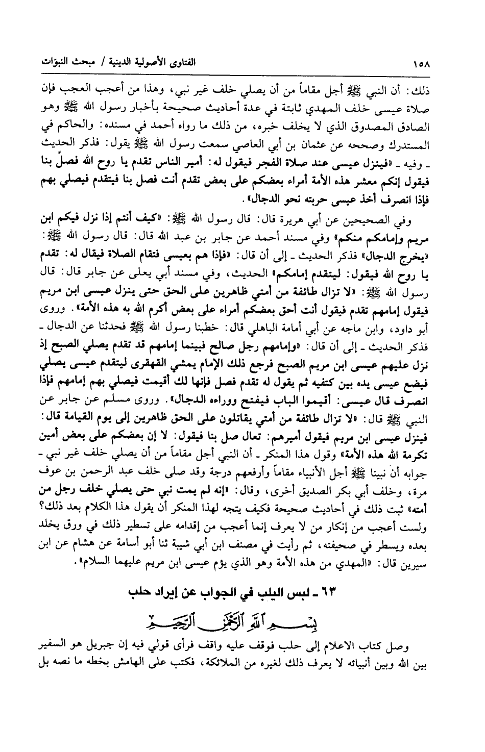وفي الصحيحين عن أبي هريرة قال: قال رسول الله صلى الله عليه وسلّم: (كيف أنتم إذا نزل فيكم ابن مريم وإمامكم منكم) وفي مسند أحمد عن جابر بن عبد الله قال: قال رسول الله صلى الله عليه وسلّم: (يخرج الدجال) فذكر الحديث إلى أن قال: (فإذا هم بعيسى فتقام الصلاة فيقال له: تقدم يا روح الله فيقول: ليتقدم إمامكم) الحديث، وفي مسند أبي يعلى عن جابر قال: قال رسول الله صلى الله عليه وسلّم: (لا تزال طائفة من أمتي ظاهرين علي الحق حتى ينزل عيسى ابن مريم فيقول إمامهم تقدم فيقول أنت أحق بعضكم أمراء على بعض أكرم الله به هذه الأمة). وروى أبو داود، وابن ماجه عن أبي أمامة الباهلي قال: خطبنا رسول الله صلى الله عليه وسلّم فحدثنا عن الدجال فذكر الحديث إلى أن قال: (وإمامهم رجل صالح فبينما إمامهم قد تقدم يصلي الصبح إذ نزل عليهم عيسى ابن مريم الصبح فرجع ذلك الإمام يمشي الفهقرى ليتقدم عيسى يصلي فيضع عيسى يده بين كتفيه ثم يقول له تقدم فصل فإنها لك أقيمت فيصلي بهم إمامهم فإذا انصرف قال عيسى: أقيموا الباب فيفتح ووراءه الدجال). وروى مسلم عن جابر عن النبي صلى الله عليه وسلّم قال: (لا تزال طائفة من أمتي يقاتلون على الحق ظاهرين إلى يوم القيامة قال: فينزل عيسى ابن مريم فيقول أميرهم: تعال صلى بنا فيقول: لا إن بعضكم على بعض أمين تكرمة الله هذه الأمة) وقول هذا المنكر أن النبي أجل مقاماً من أن يصلي خلف غير نبي جوابه أن نبينا صلى الله عليه وسلّم أجل الأنبياء مقاماف وأرفعهم درجة وقد صلى خلف عبد الرحمن بن عوف مرة، وخلف أبي بكر الصديق أخرى، وقال: (إنه لم يمت نبي حتى يصلي خلف رجل من أمته) ثبت ذلك في أحاديث صحيحة فكيف يتجه لهذا المنكر أن يقول هذا الكلام بعد ذلك؟ ولست أعجب من إنكار من لا يعرف إنما أعجب من إقدامه على تسطير ذلك في ورق يخلد بعده ويسطر في صحيفته، ثم رأيت في مصنف ابن أبي شيبة ثنا أبو أسامة عن هشام عن ابن سيرين قال: (المهدي من هذه الأمة وهو الذي يؤم عيسى ابن مريم عليهما السلام).