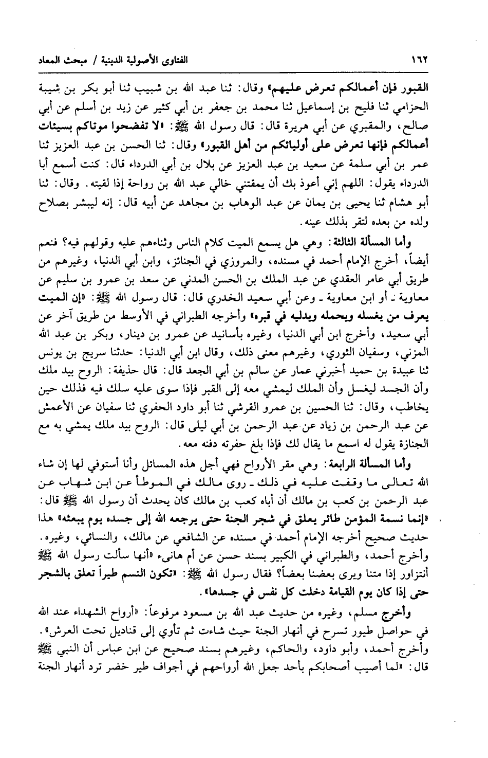 وأخرج مسلم، وغيره من حديث عبد الله بن مسعود مرفوعاً: (أرواح الشهداء عند الله في حواصل طيور تسرح في أنهار الجنة حيث شاءت ثم تأوي إلى قناديل تحت العرش). وأخرج أحمد، وأبو داود، والحاكم، وغيرهم بسند صحيح عن ابن عباس أن النبي صلى الله عليه وسلّم قال: (لما أصيب أصحابكم بأحد جعل الله أرواحهم في أجواف طير خضر ترد أنهار الجنة