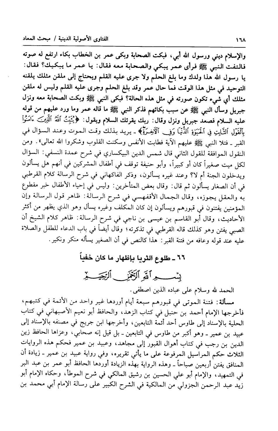 مسألة: فتنة الموتى في قبورهم سبعة أيام أوردها غير واحد من الأئمة في كتبهم، فأخرجها الإمام أحمد بن حنبل في كتاب الزهد، والحافظ أبو الأصبهاني في كتاب الحلية بالإسناد إلى طاوس أحد أئمة التابعين، وأخرجها ابن جريج في مصنفه بالإسناد إلى عبيد بن عمير وهو أكبر من طاوس في التابعين بل قيل إنه صحابي، وعزاها الحافظ زين الدين بن رجب في كتاب أهوال القبور إلى مجاهد، وعبيد بن عمير فحكم هذه الروايات الثلاث حكم المراسيل المرفوعة على ما يأتي تقريره، وفي رواية عبيد بن عمير زيادة أن المنافق يفتن أربعين صباحاً وهذه الرواية بهذه الزيادة أوردها الحافظ أبو عمر بن عبد البر في التمهيد، والإمام أبو علي الحسين بن رشيق المالكي في شرح الموطأ، وحكاه الإمام أبو زيد عبد الرحمن الجزولي من المالكية في الشرح الكبير على رسالة الإمام أبي محمد بن