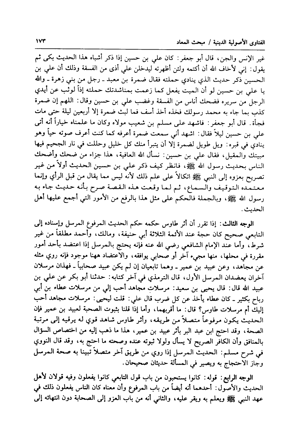 غير الإنس والجن، قال أبو جعفر: كان علي بن حسين إذا ذكر أشباه هذا الحديث بكى ثم يقول: إني لأخاف الله أن أكتمه ولئن أظهرته ليدخلن علي أذى من الفسقة وذلك أن علي بن الحسين ذكر حديث الذي ينادي حملته فقال ضمرة بن معبد رجل من بني زهرة والله يا علي بن حسين لو أن الميت يفعل كما زعمت بمناشدتك حملته إذاً لوثب عن أيدي الرجل من سريره فضحك أناس من الفسقة وغضب علي بن حسين وقال: اللهم إن ضمرة كذب بما جاء به محمد رسولك فخذه أخذ أسف فما لبث ضمرة إلا أربعين ليلة حتى مات فجأة. قال أبو جعفر: فاشهد على مسلم بن شعيب مولاه وكان ما علمناه خياراً أنه أتى علي بن حسين ليلاً فقال: اشهد أني سمعت ضمرة أعرفه كما كنت أعرف صوته حياً وهو ينادي في قبره: ويل طويل لضمرة إلا أن يتبرأ منك كل خليل وحللت في نار الجحيم فيها مبيتك والمقيل، فقال علي بن حسين: نسأل الله العافية، هذا جزاء من ضحك وأضحك الناس بحديث رسول الله صلى الله عليه وسلّم، فانظر كيف ذكر علي بن حسين الحديث أولاً من غير تصريح بعزوه إلى النبي صلى الله عليه وسلّم اتكالاً على علم ذلك لأنه ليس مما يقال من قبل الرأي وإنما معتمده التوقيف والسماع، ثم لما وقعت هذه القصة صرح بأنه حديث جاء به رسول الله صلى الله عليه وسلّم، وبالجملة فالحكم على مثل هذا بالرفع من الأمور التي أجمع عليها أهل الحديث.
