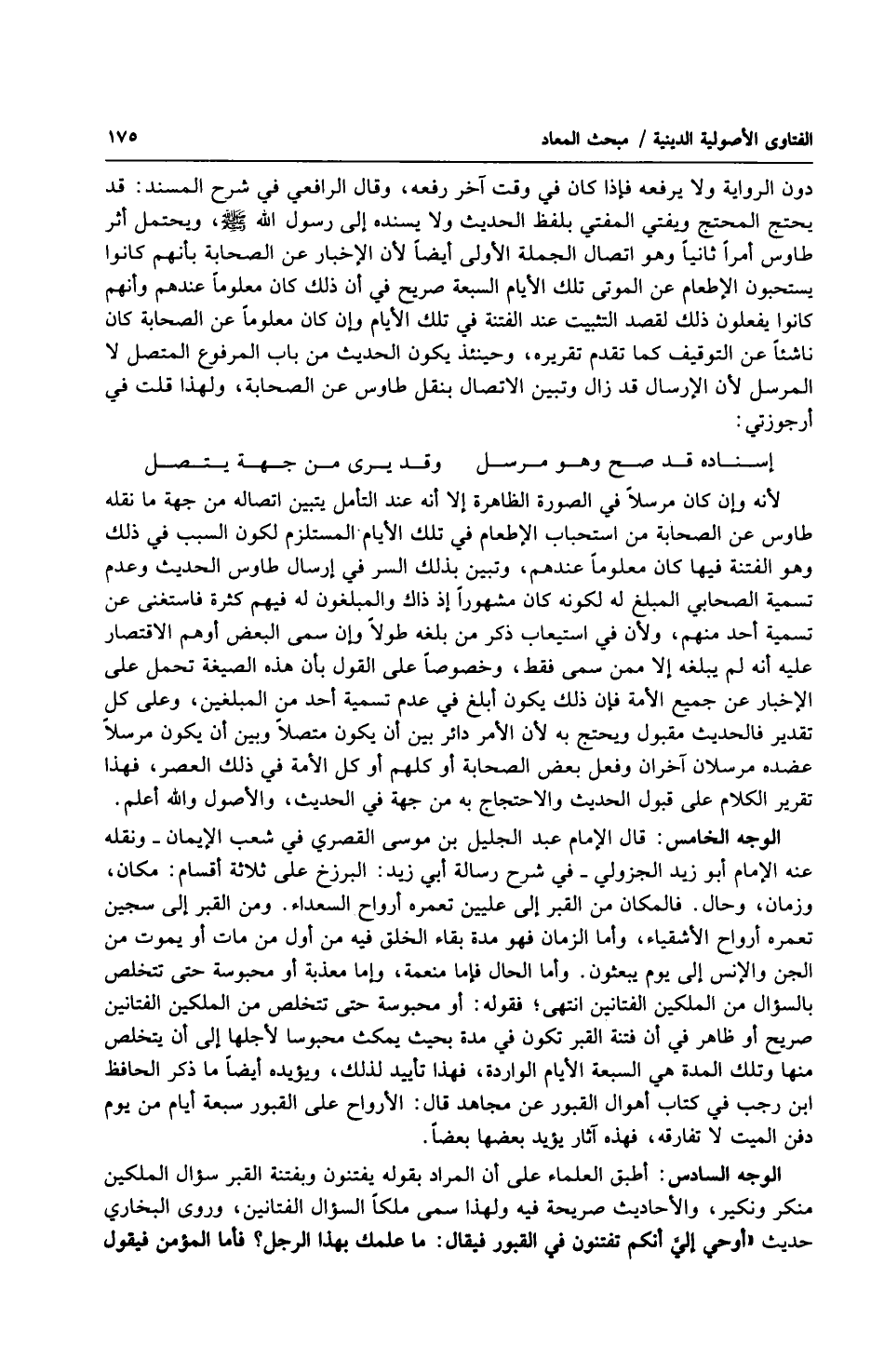الوجه الخامس: قال الإمام عبد الجليل بن موسى القصري في شعب الإيمان ونقله عنه الإمام أبو زيد الجزولي في شرح رسالة أبي زيد: البرزخ على ثلاثة أقسام: مكان، وزمان، وحال. فالمكان من القبر إلى عليين تعمره أرواح السعداء. ومن القبر إلى سجين تعمره أرواح الأشقياء، وأما الزمان فهو مدة بقاء الخلق فيه من أول من مات أو يموت من الجن والإنس إلى يوم يبعثون. وأما الحال فإما منعمة، وإما معذبة أو محبوسة حتى تتخلص بالسؤال من الملكين الفتانين انتهى؛ فقوله: أو محبوسة حتى تتخلص من الملكين الفتانين صريح أو ظاهر في أن فتنة القبر تكون في مدة بحيث يمكث محبوسا لأجلها إلى أن يتخلص منها وتلك المدة هي السبعة الأيام الواردة، فهذا تأييد لذلك، ويؤيده أيضاً ما ذكر الحافظ ابن رجب في كتاب أهوال القبور عن مجاهد قال: الأرواح على القبور سبعة أيام من يوم دفن الميت لا تفارقه، فهذه آثار يؤيد بعضها بعضاً.