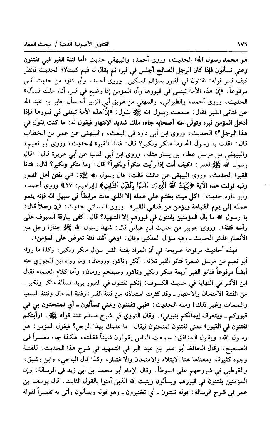 فهذه أحاديث مرفوعة صريحة في أن المراد بفتنة القبر سؤال منكر ونكير، وكذا ما رواه أبو نعيم من مرسل ضمرة فتانو القبر ثلاثة: أنكر وناكور ورومان، وما رواه ابن الجوزي عنه أيضاً مرفوعاً فتانو القبر أربعة منكر ونكير وناكور وسيدهم رومان، وأما كلام العلماء فقال ابن الأثير في النهاية في حديث الكسوف: إنكم تفتنون في القبور يريد مسألة منكر ونكير من الفتنة الامتحان والإختبار وقد كثرت استعاذته من فتنة القبر [وفتنة الدجال وفتنة المحيا والممات وغير ذلك] ومنه الحديث: (فيّ تفتنون وعني تسألون أي تمتحنون بي في قبوركم ويتعرف إيمانكم بنبوتي). وقال النووي في شرح مسلم عند قوله صلى الله عليه وسلّم: (رأيتكم تفتنون في القبور) معنى تفتنون تمتحنون فيقال: ما علمك بهذا الرجل؟ فيقول المؤمن: هو رسول الله، ويقول المنافق: سمعت الناس يقولون شيئاً فقلته، هكذا جاء مفسراً في الصحيح، وقال الحافظ أبو عمر بن عبد البر في التمهيد في شرح هذا الحديث: للفتنة وجوه كثيرة، ومعناها هنا الابتلاء والامتحان والاختبار، وكذا قال الباجي، وابن رشيق، والقرطبي في شروحهم على الموطأ. وقال الإمام أبو محمد بن أبي زيد في الرسالة: وإن المؤمنين يفتنون في قبورهم ويسألون ويثبت الله الذين آمنوا بالقول الثابت. قال يوسف بن عمر في شرح الرسالة: قوله تفتنون أي تختبرون وهو قوله ويسألون وأتى به تفسيراً لقوله