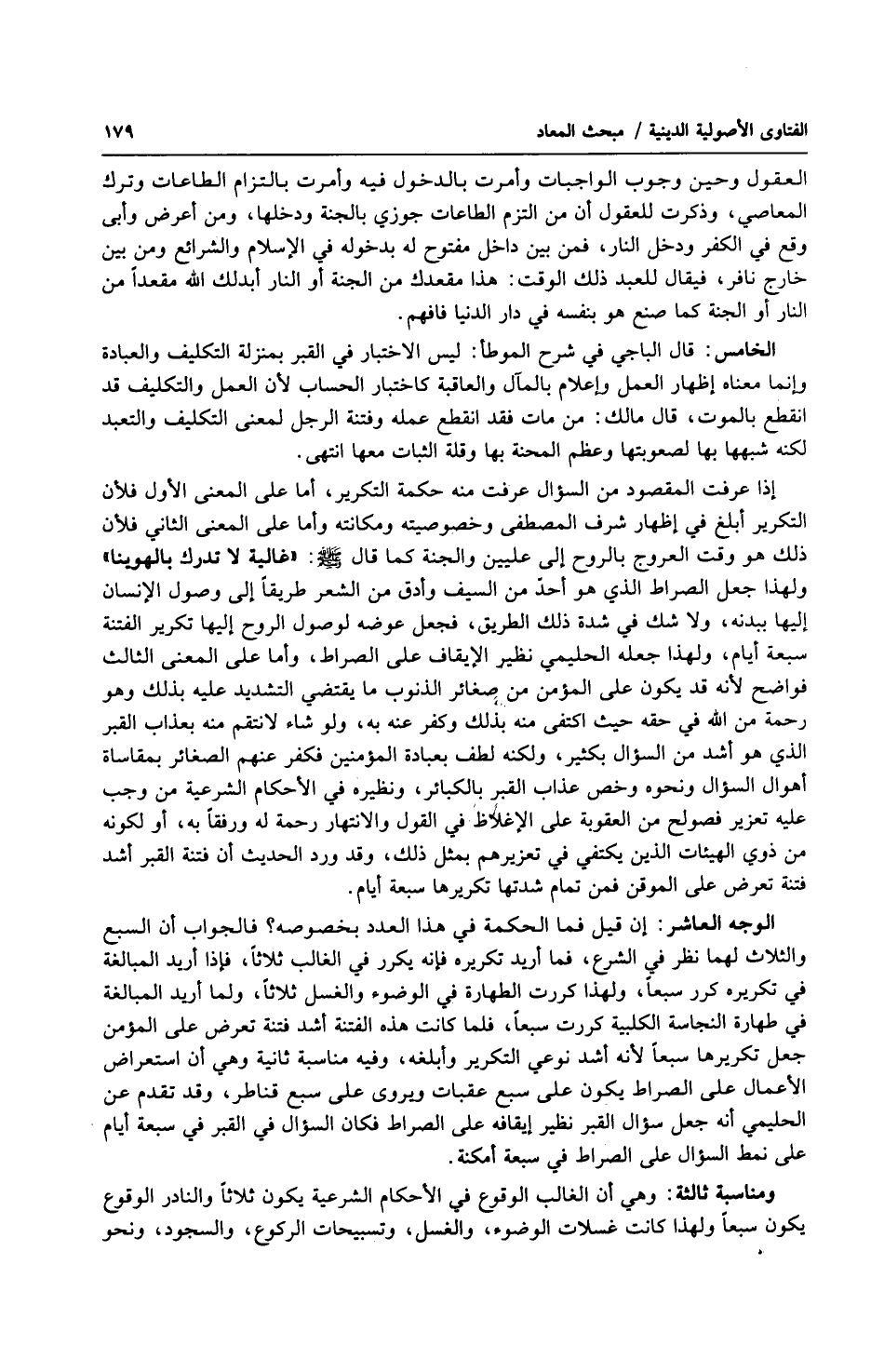 الوجه العاشر: إن قيل فما الحكمة في هذا العدد بخصوصه؟ فالجواب أن السبع والثلاث لهما نظر في الشرع، فما أريد تكريره فإنه يكرر في الغالب ثلاثاً، فإذا أريد المبالغة في تكريره كرر سبعاً، ولهذا كررت الطهارة في الوضوء والغسل ثلاثاً، ولما أريد المبالغة في طهارة النجاسة الكلبية كررت سبعاً، فلما كانت هذه الفتنة أشد فتنة تعرض على المؤمن جعل تكريرها سبعاً لأنه أشد نوعي التكرير وأبلغه، وفيه مناسبة ثانية وهي أن استعراض الأعمال على الصراط يكون على سبع عقبات ويروى على سبع قناطر، وقد تقدم عن الحليمي أنه جعل سؤال القبر نظير إيقافه على الصراط فكان السؤال في القبر في سبعة أيام على نمط السؤال على الصراط في سبعة أمكنة.