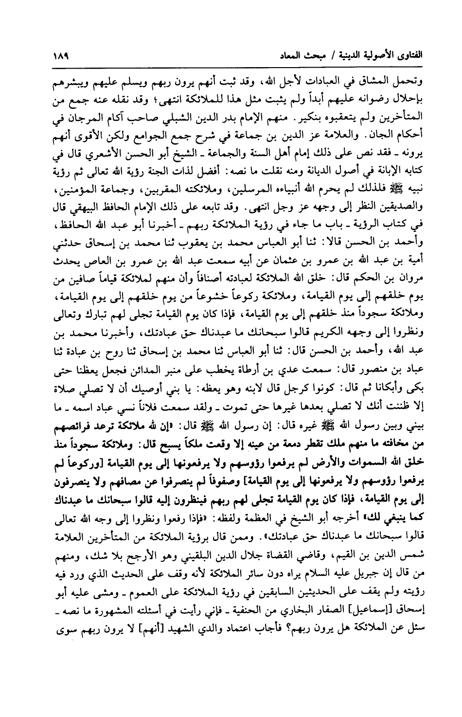 وتحمل المشاق في العبادات لأجل الله، وقد ثبت أنهم يرون ربهم ويسلم عليهم ويبشرهم بإحلال رضوانه عليهم أبداً ولم يثبت مثل هذا للملائكة انتهى؛ وقد نقله عنه جمع من المتأخرين ولم يتعقبوه بنكير. منهم الإمام بدر الدين الشبلي صاحب آكام المرجان في أحكام الجان. والعلامة عز الدين بن جماعة في شرح جمع الجوامع ولكن الأقوى أنهم يرونه فقد نص على ذلك إمام أهل السنة والجماعة الشيخ أبو الحسن الأشعري قال في كتابه الإبانة في أصول الديانة ومنه نقلت ما نصه: أفضل لذات الجنة رؤية الله تعالى ثم رؤية نبيه صلى الله عليه وسلّم فلذلك لم يحرم الله أنبياءه المرسلين، وملائكته المقربين، وجماعة المؤمنين، والصديقين النظر إلى وجهه عز وجل انتهى. وقد تابعه على ذلك الإمام الحافظ البيهقي قال في كتاب الرؤية باب ما جاء في رؤية الملائكة ربهم أخبرنا أبو عبد الله الحافظ، وأحمد بن الحسن قالا: ثنا أبو العباس محمد بن يعقوب ثنا محمد بن إسحاق حدثني أمية بن عبد الله بن عمرو بن عثمان عن أبيه سمعت عبد الله بن عمرو بن العاص يحدث مروان بن الحكم قال: خلق الله الملائكة لعبادته أصنافاً وأن منهم لملائكة قياماً صافين من يوم خلقهم إلى يوم القيامة، وملائكة ركوعاً خشوعاً من يوم خلقهم إلى يوم القيامة، وملائكة سجوداً منذ خلقهم إلى يوم القيامة، فإذا كان يوم القيامة تجلى لهم تبارك وتعالى ونظرو إلى وجهه الكريم قالوا سبحانك ما عبدناك حق عبادتك، وأخبرنا محمد بن عبد الله، وأحمد بن الحسن قال: ثنا أبو العباس ثنا محمد بن إسحاق ثنا روح بن عبادة ثنا عباد بن منصور قال: سمعت عدي بن أرطاة يخطب على منبر المدائن فجعل يعظنا حتى بكى وأبكانا ثم قال: كونوا كرجل قال لابنه وهو يعظه: يا بني أوصيك أن لا تصلي صلاة إلا ظننت أنك لا تصلي بعدها غيرها حتى تموت ولقد سمعت فلاناً نسي عباد اسمه ما بيني وبين رسول الله صلى الله عليه وسلّم غيره قال: إن رسول الله صلى الله عليه وسلّم قال: (إن لله ملائكة ترعد فرائصهم من مخافته ما منهم ملك تقطر دمعة من عينه إلا وقعت ملكاً يسبح قال: وملائكة سجوداً منذ خلق الله السموات والأرض لم يرفعوا رؤوسهم ولا يرفعونها إلى يوم القيامة [وركوعاً لم يرفعوا رؤوسهم ولا يرفعونها إلى يوم القيامة] وصفوفاً لم ينصرفوا عن مصافهم ولا ينصوفون إلى يوم القيامة، فإذا كان يوم القيامة تجلى لهم ربهم فينظرون إليه قالوا سبحانك ما عبدناك كما ينبغي لك) أخرجه أبو الشيخ في العظمة ولفظه: (فإذا رفعوا ونظروا إلى وجه الله تعالى قالوا سبحانك ما عبدناك حق عبادتك). وممن قال برؤية الملائكة من المتأخرين العلامة شمس الدين بن القيم، وقاضي القضاة جلال الدين البلقيني وهو الأرجح بلا شك، ومنهم من قال إن جبريل عليه السلام يراه دون سائر الملائكة لأنه وقف على الحديث الذي ورد فيه رؤيته ولم يقف على الحديثين السابقين في رؤية الملائكة على العموم ومشى عليه أبو إسحاق [إسماعيل] الصفار البخاري من الحنفية فإني رأيت في أسئلته المشهورة ما نصه سئل عن الملائكة هل يرون ربهم؟ فأجاب اعتماد والدي الشهيد [أنهم] لا يرون ربهم سوى