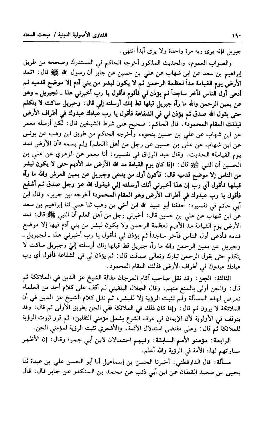 الثالثة : الجن : وقد نقل صاحب آكام المرجان مقالة الشيخ عز الدين في الملائكة ثم قال : والجن أولى بالمنع منهم ، وقال الجلال البلقيني لم أقف على كلام أحد من العلماء تعرض لهذه المسألة ولم تثبت الرؤية إلا للبشر ، ثم نقل كلام الشيخ عز الدين في أن الملائكة لا يرون ثم قال : وإذا كان ذلك في الملائكة ففي الجن بطريق الأولى ثم قال : وقد يتوقف في الأولوية لأن الإيمان في عرف الشرع يشمل مؤمني الثقلين ، ثم قرر ثبوت الرؤية للملائكة ثم قال : وعلى مقتضى استدلال الأئمة ، والأشعري تثبت الرؤية لمؤمني الجن.
