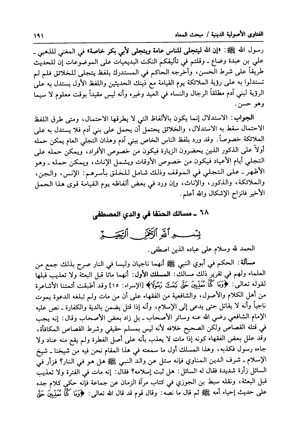 مسألة: الحكم في أبوي النبي صلى الله عليه وسلّم أنهما ناجيان وليسا في النار صرح بذلك جمع من العلماء ولهم في تقرير ذلك مسالك: المسلك الأول: أنهما ماتا قبل البعثة ولا تعذيب قبلها لقوله تعالى:) وما كنا معذبين حتى نبعث رسولاً (وقد أطبقت أئمتنا الأشاعرة من أهل الكلام والأصول، والشافعية من الفقهاء على أن من مات ولم تبلغه الدعوة يموت ناجياً وأنه لا يقاتل حتى يدعى إلى الإسلام، وأنه إذا قتل يضمن بالدية والكفارة نص عليه الإمام الشافعي رضي الله عنه وسائر الأصحاب بل زاد بعض الأصحاب وقال: إنه يجب في قتله القصاص ولكن الصحيح خلافه لأنه ليس بمسلم حقيقي وشرط القصاص المكافأة، وقد علل بعض الفقهاء كونه إذا مات لا يعذب بأنه على أصل الفطرة ولم يقع منه عناد ولا جاءه رسول فكذبه، وهذا المسلك أول ما سمعته في هذا المقام نحن فيه من شيخنا شيخ الإسلام شرف الدين المناوي فإنه سئل عن والد النبي صلى الله عليه وسلّم هل هو في النار؟ فزأر في السائل زأرة شديدة فقال له السائل: هل ثبت إسلامه؟ فقال: إنه مات في الفترة ولا تعذيب قبل البعثة، ونقله سبط ابن الجوزي في كتاب مرآة الزمان عن جماعة فإنه حكى كلام جده على حديث إحياء أمه صلى الله عليه وسلّم ثم قال ما نصه: وقال قوم قد قال الله تعالى:) وما كنا معذبين حتى