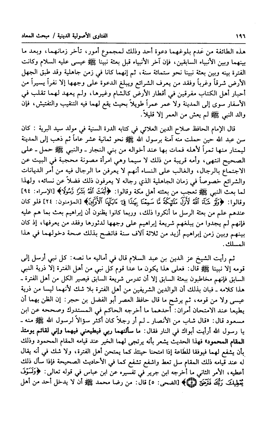 ثم رأيت الشيخ عز الدين بن عبد السلام قال في أماليه ما نصه : كل نبي أرسل إلى قومه إلا نبينا صلى الله عليه وسلّم قال : فعلى هذا يكون ما عدا قوم كل نبي من أهل الفترة إلا ذرية النبي السابق فإنهم مخاطبون ببعثة السابق إلا أن تدرس شريعة السابق فيصير الكل من أهل الفترة هذا كلامه فبان بذلك أن الوالدين الشريفين من أهل الفترة بلا شك لأنهما ليسا من ذرية عيسى ولا من قومه ، ثم يرشح ما قال حافظ العصر أبو الفضل بن حجر : أن الظن بهما أن يطيعا عند الامتحان أمران : أحدهما ما أخرجه الحاكم في المستدرك وصححه عن ابن مسعود قال : ( قال شاب من الأنصار لم أر رجلاً كان أكثر سؤالاً لرسول الله صلى الله عليه وسلّم منه يا رسول الله أرأيت أبواك في النار فقال : ما سألتهما ربي فيطيعني فيهما وإني لقائم يومئذ المقام المحمود ) فهذا الحديث يشعر بأنه يرتجى لهما الخير عند قيامه المقام المحمود وذلك بأن يشفع لهما فيوفقا للطاعة إذا امتحنا حينئذ كما يمتحن أهل الفترة ، ولا شك في أنه يقال له عند قيامه ذلك المقام سل تعط واشفع تشفع كما في الأحاديث الصحيحة فإذا سأل ذلك أعطيه ، الأمر الثاني ما أخرجه ابن جرير في تفسيره عن ابن عباس في قوله تعالى : ) ولسوف يعطيك ربك فترضى ( قال : من رضا محمد صلى الله عليه وسلّم أن لا يدخل أحد من أهل