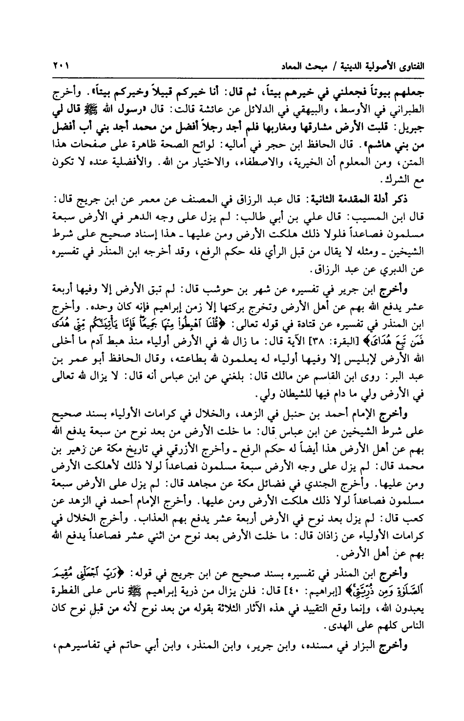 وأخرج ابن جرير في تفسيره عن شهر بن حوشب قال : لم تبق الأرض إلا وفيها أربعة عشر يدفع الله بهم عن أهل الأرض وتخرج بركتها إلا زمن إبراهيم فإنه كان وحده. وأخرج ابن المنذر في تفسيره عن قتادة في قوله تعالى : ) قلنا اهبطوا منها جميعاً فإما يأتينكم مني هدى فمن تبع هداي ( الآية قال : ما زال لله في الأرض أولياء منذ هبط آدم ما أخلى الله الأرض لإبليس إلا وفيها أولياء له يعلمون لله بطاعته ، وقال الحافظ أبو عمر بن عبد البر : روى ابن القاسم عن مالك قال : بلغني عن ابن عباس أنه قال : لا يزال لله تعالى في الأرض ولي ما دام فيها للشيطان ولي.