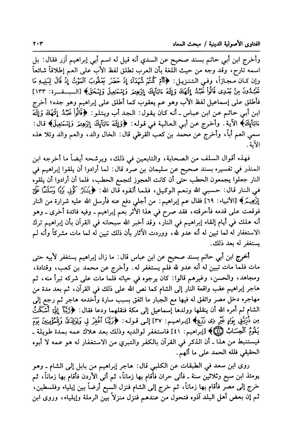 أخرج ابن أبي حاتم بسند صحيح عن ابن عباس قال: ما زال إبراهيم يستغفر لأبيه حتى مات فلما مات تبين له أنه عدو لله فلم يستغفر له. وأخرج عن محمد بن كعب، وقتادة، ومجاهد، والحسن، وغيرهم قالوا: كان يرجوه في حياته فلما مات على شركه تبرأ منه، ثم هاجر إبراهيم عقب واقعة النار إلى الشام كما نص الله على ذلك في القرآن، ثم بعد مدة من مهاجره دخل مصر واتفق له فيها مع الجبار ما اتفق بسبب سارة وأخدمه هاجر ثم رجع إلى الشام ثم أمره الله أن ينقلها وولدها إسماعيل إلى مكة فنقلهما ودعا فقال:) ربنا إني أسكنت من ذريتي بواد غير ذي زرع (إلى قوله:) ربنا اغفر لي ولوالدي وللمؤمنين يوم يقوم الحساب (فاستغفر لوالديه وذلك بعد هلاك عمه بمدة طويلة فيستنبط من هذا أن الذكر في القرآن بالكفر والتبري من الاستغفار له هو عمه لا أبوه الحقيقي فلله الحمد على ما ألهم.