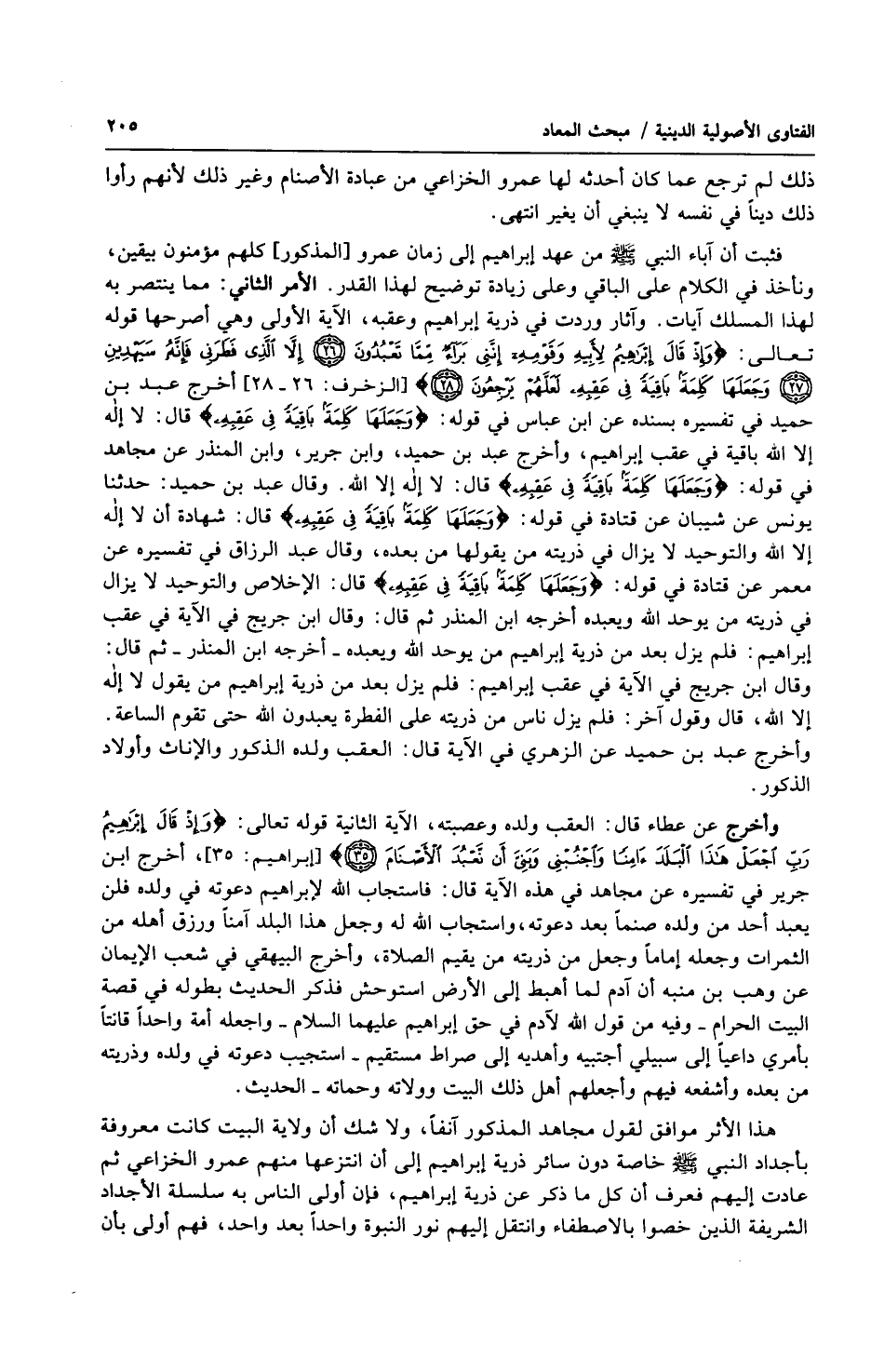 فثبت أن آباء النبي صلى الله عليه وسلّم من عهد إبراهيم إلى زمان عمرو [المذكور] كلهم مؤمنون بيقين، ونأخذ في الكلام على الباقي وعلى زيادة توضيح لهذا القدر. الأمر الثاني: مما ينتصر به لهذا المسلك آيات. وآثار وردت في ذرية إبراهيم وعقبه، الآية الأولى وهي أصرحها قوله تعالى:) وإذ قال إبراهيم لأبيه وقومه انني براء مما تعبدون إلا الذي فطرني فإنه سيهدين وجعلها كلمة باقية في عقبة (أخرج عبد بن حميد في تفسيره بسنده عن ابن عباس في قوله:) وجعلها كلمة باقية في عقبه (قال: لا إله إلا الله باقية في عقب إبراهيم، وأخرج عبد بن حميد، وابن جرير، وابن المنذر عن مجاهد في قوله:) وجعلها كلمة باقية في عقبه (قال: لا إله إلا الله. وقال عبد بن حميد: حدثنا يونس عن شيبان عن قتادة في قوله:) وجعلها كلمة باقية في عقبه (قال: شهادة أن لا إله إلا الله والتوحيد لا يزال في ذريته من يقولها من بعده، وقال عبد الرزاق في تفسيره عن معمر عن قتادة في قوله:) وجعلها كلمة باقية في عقبه (قال: الإخلاص والتوحيد لا يزال في ذريته من يوحد الله ويعبده أخرجه ابن المنذر ثم قال: وقال ابن جريج في الآية في عقب إبراهيم: فلم يزل بعد من ذرية إبراهيم من يوحد الله ويعبده أخرجه ابن المنذر ثم قال: وقال ابن جريج في الآية في عقب إبراهيم: فلم يزل بعد من ذرية إبراهيم من يقول لا إله إلا الله، قال وقول آخر: فلم يزل ناس من ذريته على الفطرة يعبدون الله حتى تقوم الساعة. وأخرج عبد بن حميد عن الزهري في الآية قال: العقب ولده الذكور والإناث وأولاد الذكور.