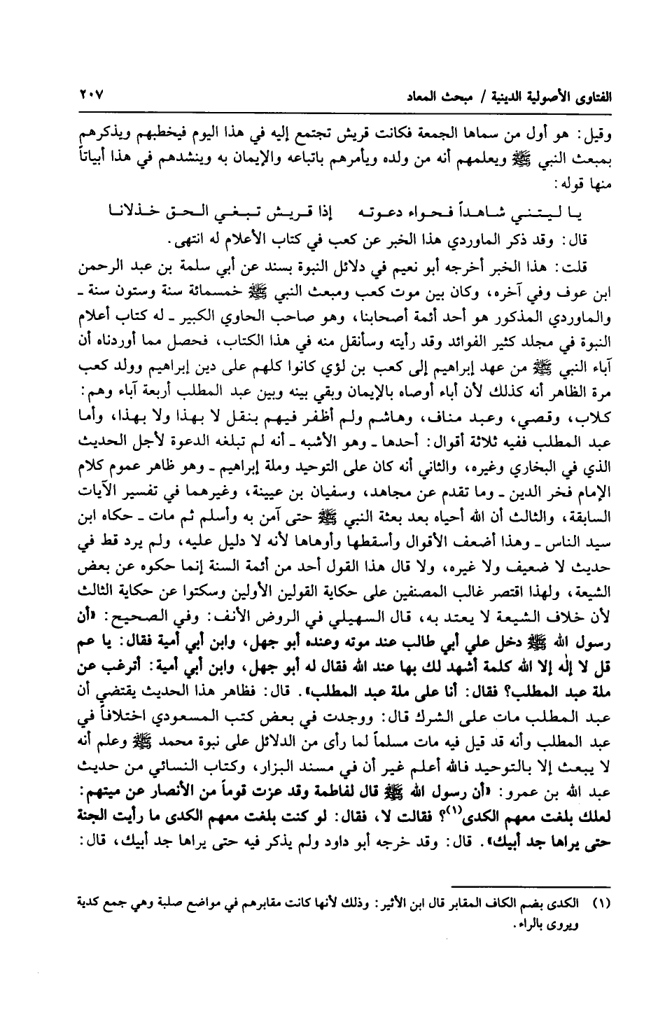 قلت: هذا الخبر أخرجه أبو نعيم في دلائل النبوة بسند عن أبي سلمة بن عبد الرحمن ابن عوف وفي آخره، وكان بين موت كعب ومبعث النبي صلى الله عليه وسلّم خمسمائة سنة وستون سنة والماوردي المذكور هو أحد أئمة أصحابنا، وهو صاحب الحاوي الكبير له كتاب أعلام النبوة في مجلد كثير الفوائد وقد رأيته وسأنقل منه في هذا الكتاب، فحصل مما أوردناه أن آباء النبي صلى الله عليه وسلّم من عهد إبراهيم إلى كعب بن لؤي كانوا كلهم على دين إبراهيم وولد كعب مرة الظاهر أنه كذلك لأن أباء أوصاه بالإيمان وبقي بينه وبين عبد المطلب أربعة آباء وهم: كلاب، وقصي، وعبد مناف، وهاشم ولم أظفر فيهم بنقل لا بهذا ولا بهذا، وأما عبد المطلب ففيه أقوال: أحدها وهو الأشبه أنه لم تبلغه الدعوة لأجل الحديث الذي في البخاري وغيره، والثاني أنه كان على التوحيد وملة إبراهيم وهو ظاهر عموم كلام الإمام فخر الدين وما تقدم عن مجاهد، وسفيان بن عيينة، وغيرهما في تفسير الآيات السابقة، والثالث أن الله أحياه بعد بعثة النبي صلى الله عليه وسلّم حتى آمن به وأسلم ثم مات حكاه ابن سيد الناس وهذا أضعف الأقوال وأسقطها وأوهاها لأنه لا دليل عليه، ولم يرد قط في حديث لا ضعيف ولا غيره، ولا قال هذا القول أحد من أئمة السنة إنما حكوه عن بعض الشيعة، ولهذا اقتصر غالب المصنفين على حكاية القولين الأولين وسكتوا عن حكاية الثالث لأن خلاف الشيعة لا يعتد به، قال السهيلي في الروض الأنف: وفي الصحيح: (أن رسول الله صلى الله عليه وسلّم دخل على أبي طالب عند موته وعنده أبو جهل، وابن أبي أمية فقال: يا عم قل لا إله إلا الله كلمة أشهد لك بها عند الله فقال له أبو جهل، وابن أبي أمية: أترغب عن ملة عبد المطلب؟ فقال: أنا على ملة عبد المطلب). قال: فظاهر هذا الحديث يقتضي أن عبد المطلب مات على الشرك قال: ووجدت في بعض كتب المسعودي اختلافاً في عبد المطلب وأنه قد قيل فيه مات مسلماً لما رأى من الدلائل على نبوة محمد صلى الله عليه وسلّم وعلم أنه لا يبعث إلا بالتوحيد ف الله أعلم غير أن في مسند البزار، وكتاب النسائي من حديث عبد الله بن عمرو: (أن رسول الله صلى الله عليه وسلّم قال لفاطمة وقد عزت قوماً من الأنصار عن ميتهم: لعلك بلغت معهم الكدى؟ فقالت لا، فقال: لو كنت بلغت معهم الكدى ما رأيت الجنة حتى يراها جد أبيك). قال: وقد خرجه أبو داود ولم يذكر فيه حتى يراها جد أبيك، قال: