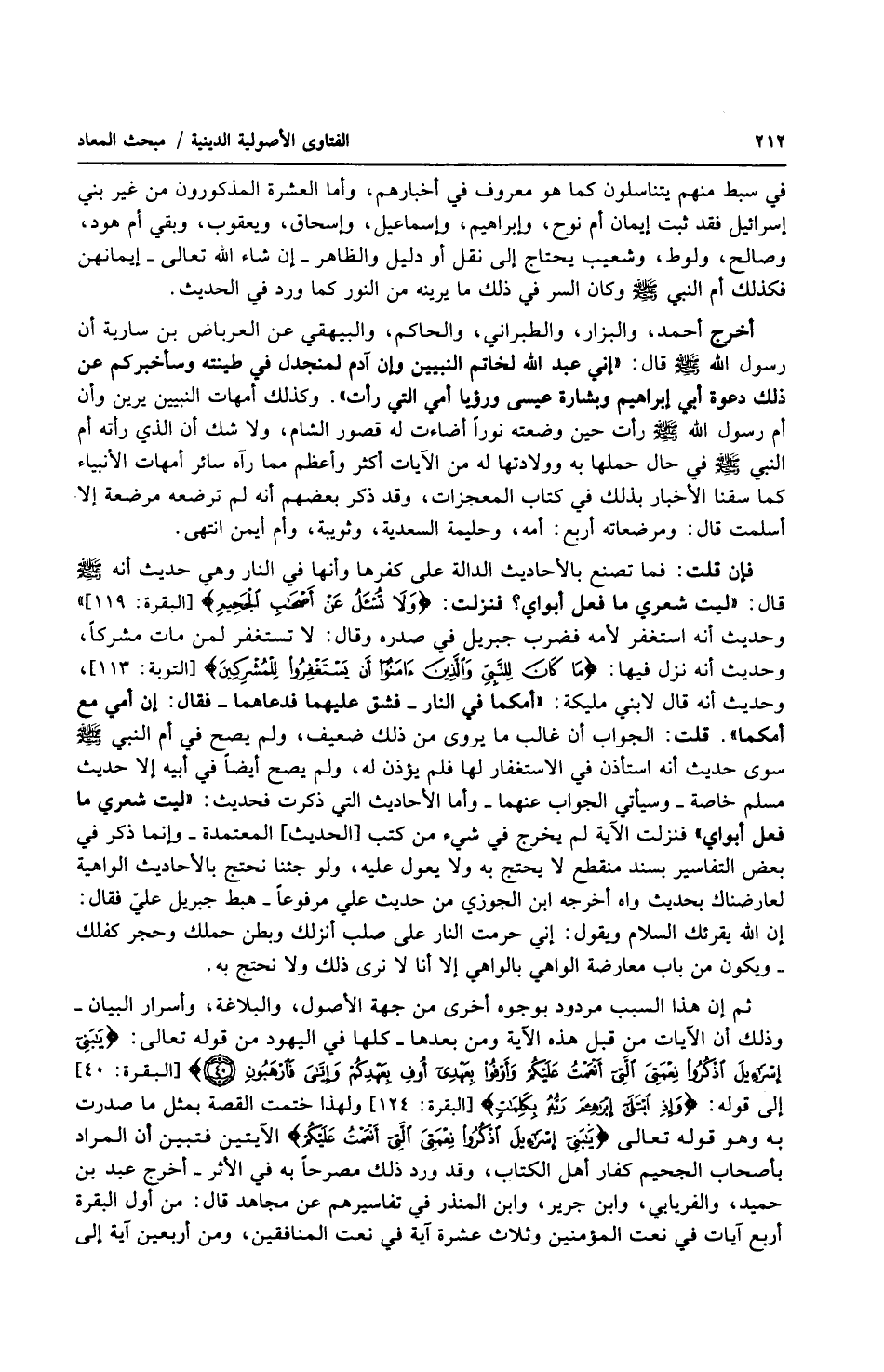 فإن قلت: فما تصنع بالأحاديث الدالة على كفرها وأنها في النار وهي حديث أنه صلى الله عليه وسلّم قال: (ليت شعري ما فعل أبواي؟ فنزلت:) ولا تسأل عن أصحاب الجحيم () وحديث أنه استغفر لأمه فضرب جبريل في صدره وقال: لا تستغفر لمن مات مشركاً، وحديث أنه نزل فيها:) ما كان للنبي والذين آمنوا أن يستغفروا للمشركين (، وحديث أنه قال لابني مليكة: (أمكما في النار فشق عليهما فدعاهما فقال: إن أمي مع أمكما). قلت: الجواب أن غالب ما يروى من ذلك ضعيف، ولم يصح في أم النبي صلى الله عليه وسلّم سوى حديث أنه استأذن في الاستغفار لها فلم يؤذن له، ولم يصح أيضاً في أبيه إلا حديث مسلم خاصة وسيأتي الجواب عنهما وأما الأحاديث التي ذكرت فحديث: (ليت شعري ما فعل أبواي) فنزلت الآية لم يخرج في شيء من كتب [الحديث] المعتمدة وإنما ذكر في بعض التفاسير بسند منقطع لا يحتج به ولا يعول عليه، ولو جئنا نحتج بالأحاديث الواهية لعارضناك بحديث واه أخرجه ابن الجوزي من حديث علي مرفوعاً هبط جبريل عليّ فقال: إن الله يقرئك السلام ويقول: إني حرمت النار على صلب أنزلك وبطن حملك وحجر كفلك ويكون من باب معارضة الواهي بالواهي إلا أنا لا نرى ذلك ولا نحتج به.