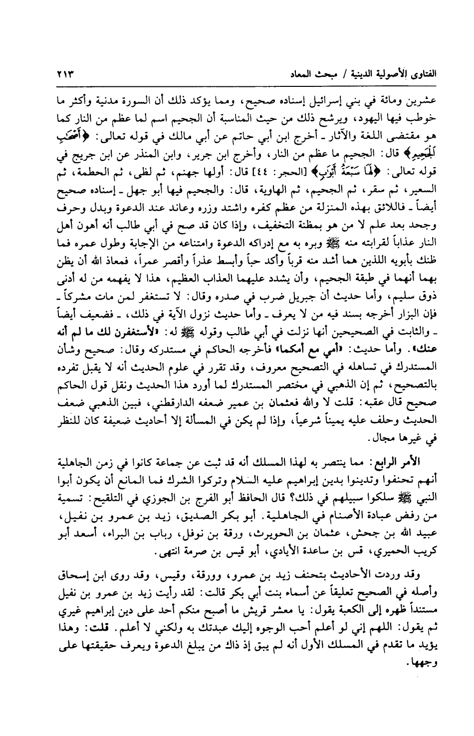 عشرين ومائة في بني إسرائيل إسناده صحيح، ومما يؤكد ذلك أن السورة مدنية وأكثر ما خوطب فيها اليهود، ويرشح ذلك من حيث المناسبة أن الجحيم اسم لما عظم من النار كما هو مقتضى اللغة والآثار أخرج ابن أبي حاتم عن أبي مالك في قوله تعالى:) أصحاب الجحيم (قال: الجحيم ما عظم من النار، وأخرج ابن جرير، وابن المنذر عن ابن جريج في قوله تعالى:) لها سبعة أبواب (قال: أولها جهنم، ثم لظى، ثم الحطمة، ثم السعير، ثم سقر، ثم الجحيم، ثم الهاوية، قال: والجحيم فيها أبو جهل إسناده صحيح أيضاً فاللائق بهذه المنزلة من عظم كفره واشتد وزره وعاند عند الدعوة وبدل وحرف وجحد بعد علم لا من هو بمظنة التخفيف، وإذا كان قد صح في أبي طالب أنه أهون أهل النار عذاباً لقرابته منه صلى الله عليه وسلّم وبره به مع إدراكه الدعوة وامتناعه من الإجابة وطول عمره فما ظنك بأبويه اللذين هما أشد منه قرباً وأكد حباً وأبسط عذراً وأقصر عمراً، فمعاذ الله أن يظن بهما أنهما في طبقة الجحيم، وأن يشدد عليهما العذاب العظيم، هذا لا يفهمه من له أدنى ذوق سليم، وأما حديث أن جبريل ضرب في صدره وقال: لا تستغفر لمن مات مشركاً فإن البزار أخرجه بسند فيه من لا يعرف وأما حديث نزول الآية في ذلك، فضعيف أيضاً والثابت في الصحيحين أنها نزلت في أبي طالب وقوله صلى الله عليه وسلّم له: (لأستغفرن لك ما لم أنه عنك). وأما حديث: (أمي مع أمكما) فأخرجه الحاكم في مستدركه وقال: صحيح وشأن المستدرك في تساهله في التصحيح معروف، وقد تقرر في علوم الحديث أنه لا يقبل تفرده بالتصحيح، ثم أن الذهبي في مختصر المستدرك لما أورد هذا الحديث ونقل قول الحاكم صحيح قال عقبه: قلت لا والله فعثمان بن عمير ضعفه الدارقطني، فبين الذهبي ضعف الحديث وحلف عليه يميناً شرعياً، وإذا لم يكن في المسألة إلا أحاديث ضعيفة كان للنظر في غيرها مجال.