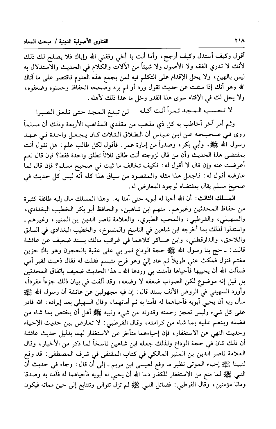 المسلك الثالث: أن الله أحيا له أبويه حتى آمنا به. وهذا المسلك مال إليه طائفة كثيرة من حفاظ المحدثين وغيرهم. منهم ابن شاهين، والحافظ أبو بكر الخطيب البغدادي، والسهيلي، والقرطبي، والمحب الطبري، والعلامة ناصر الدين بن المنير، وغيرهم واستدلوا لذلك بما أخرجه ابن شاهين في الناسخ والمنسوخ، والخطيب البغدادي في السابق واللاحق، والدارقطني، وابن عساكر كلاهما في غرائب مالك بسند ضعيف عن عائشة قالت: حج بنا رسول الله صلى الله عليه وسلّم حجة الوداع فمر بي على عقبة بالحجون وهو باك حزين مغتم فنزل فمكث عني طويلاً ثم عاد إليّ وهو فرح متبسم فقلت له فقال ذهبت لقبر أمي فسألت الله أن يحييها فأحياها فآمنت بي وردها الله هذا الحديث ضعيف باتفاق المحدثين بل قيل إنه موضوع لكن الصواب ضعفه لا وضعه، وقد ألفت في بيان ذلك جزءاً مفرداً، وأورد السهيلي في الروض الأنف بسند قال: إن فيه مجهولين عن عائشة أن رسول الله صلى الله عليه وسلّم سأل ربه أن يحيي أبويه فأحياهما له فآمنا به ثم أماتهما، وقال السهيلي بعد إيراده: الله قادر على كل شيء وليس تعجز رحمته وقدرته عن شيء ونبيه صلى الله عليه وسلّم أهل أن يختص بما شاء من فضله وينعم عليه بما شاء من كرامته، وقال القرطبي: لا تعارض بين حديث الإحياء وحديث النهي عن الاستغفار، فإن إحياءهما متأخر عن الاستغفار لهما بدليل حديث عائشة أن ذلك كان في حجة الوداع ولذلك جعله ابن شاهين ناسخاً لما ذكر من الأخبار، وقال العلامة ناصر الدين بن المنير المالكي في كتاب المقتفى في شرف المصطفى: قد وقع لنبينا صلى الله عليه وسلّم إحياء الموتى نظير ما وفع لعيسى ابن مريم إلى أن قال: وجاء في حديث أن النبي صلى الله عليه وسلّم لما منع من الاستغفار للكفار دعا الله أن يحيي له أبويه فأحياهما له فآمنا به وصدقا وماتا مؤمنين، وقال القرطبي: فضائل النبي صلى الله عليه وسلّم لم تزل وتتتابع إلى حين مماته فيكون