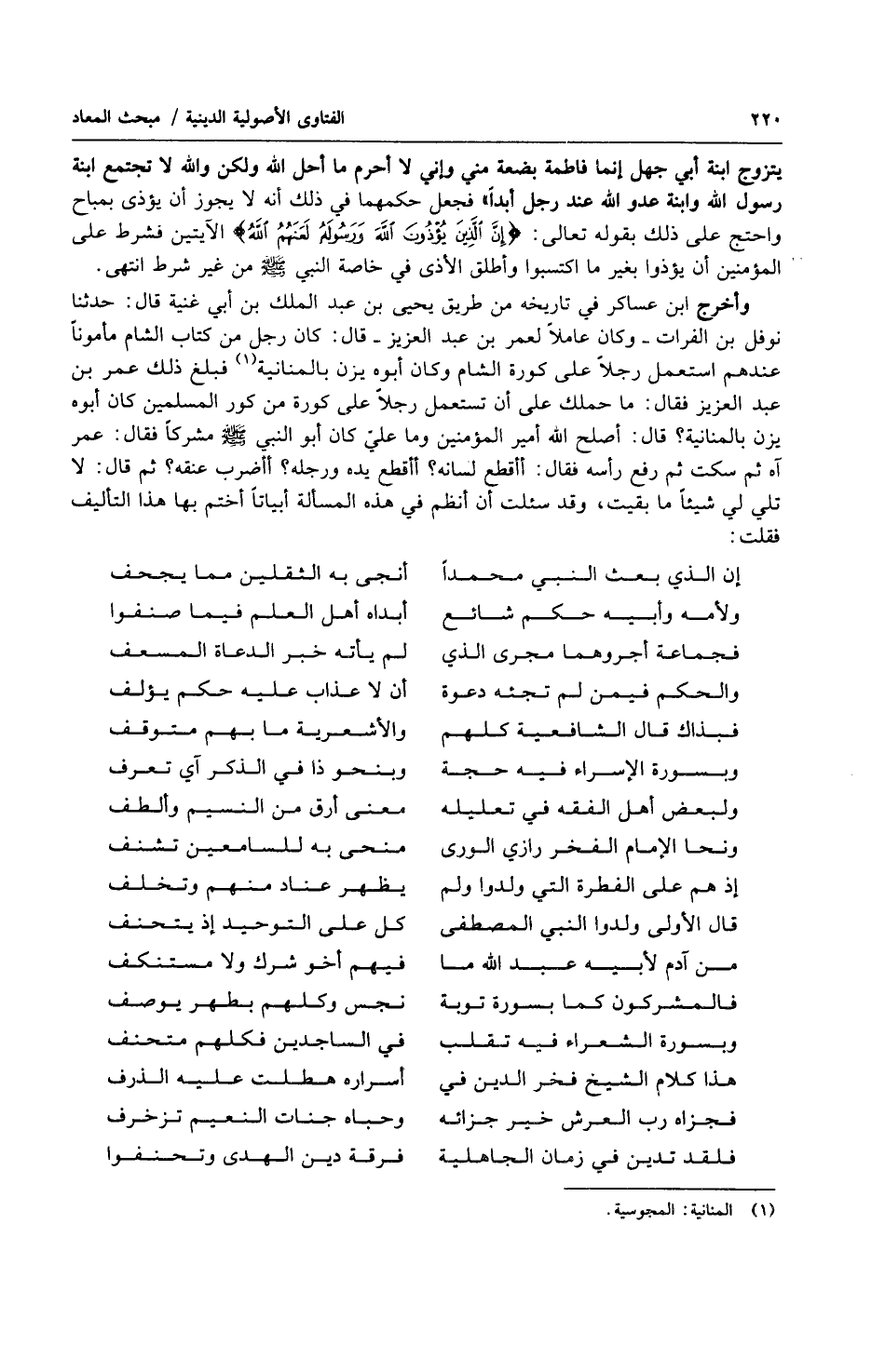 يتزوج ابنة أبي جهل إنما فاطمة بضعة مني وإني لا أحرم ما أحل الله ولكن والله لا تجتمع ابنة رسول الله وابنة عدو الله عند رجل أبداً) فجعل حكمهما في ذلك أنه لا يجوز أن يؤذى بمباح واحتج على ذلك بقوله تعالى:) إن الذين يؤذون الله ورسوله لعنهم الله (الآيتين فشرط على المؤمنين أن يؤذوا بغير ما اكتسبوا وأطلق الأذى في خاصة النبي صلى الله عليه وسلّم من غير شرط انتهى.