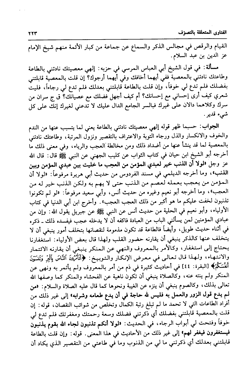 مسألة: في قول الشيخ أبي العباس المرسي في حزبه: إلهي معصيتك نادتني بالطاعة وطاعتك نادتني بالمعصية ففي أيهما أخافك وفي أيهما أرجوك؟ إن قلت بالمعصية قابلتني بفضلك فلم تدع لي خوفاً، وإن قلت بالطاعة قابلتني بعدلك فلم تدع لي رجاءً، فليت شعري كيف أرى إحساني مع إحسانك؟ أم كيف أجهل فضلك مع عصيانك؟ ق ج سران من سرك وكلاهما دالان على غيرك فبالسر الجامع الدال عليك لا تدعني لغيرك على كل شيء قدير.
