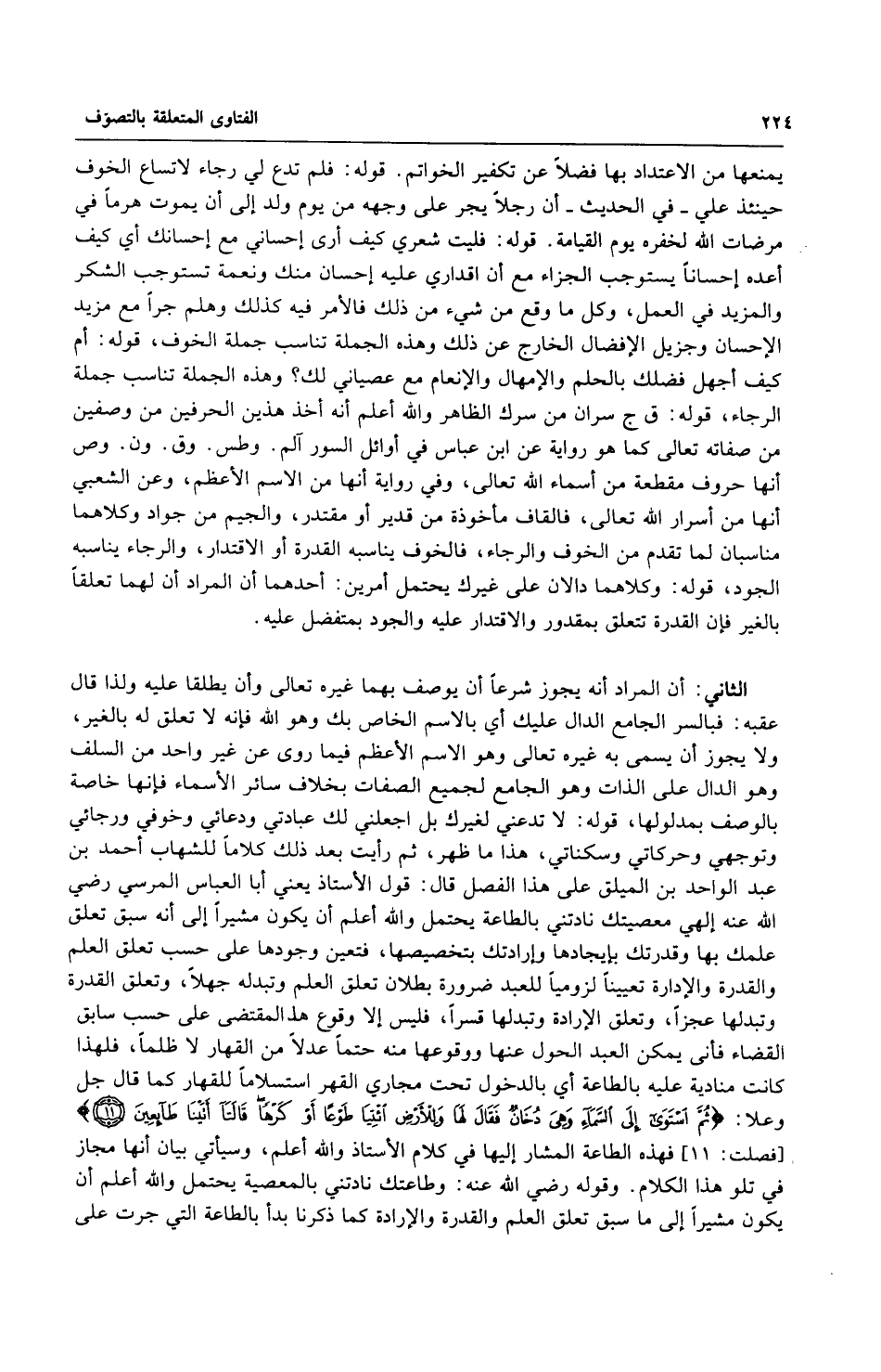 الثاني : أن المراد أنه يجوز شرعاً أن يوصف بهما غيره تعالى وأن يطلقا عليه ولذا قال عقبه : فبالسر الجامع الدال عليك أي بالاسم الخاص بك وهو الله فإنه لا تعلق له بالغير ، ولا يجوز أن يسمى به غيره تعالى وهو الاسم الأعظم فيما روى عن غير واحد من السلف وهو الدال على الذات وهو الجامع لجميع الصفات بخلاف سائر الأسماء فإنها خاصة بالوصف بمدلولها ، قوله : لا تدعني لغيرك بل اجعلني لك عبادتي ودعائي وخوفي ورجائي وتوجهي وحركاتي وسكناتي ، هذا ما ظهر ، ثم رأيت بعد ذلك كلاماً للشهاب أحمد بن عبد الواحد بن الميلق على هذا الفصل قال : قول الأستاذ يعني أبا العباس المرسي رضي الله عنه إلهي معصيتك نادتني بالطاعة يحتمل والله أعلم أن يكون مشيراً إلى أنه سبق تعلق علمك بها وقدرتك بإيجادها وإرادتك بتخصيصها ، فتعين وجودها على حسب تعلق العلم والقدرة والإدارة تعييناً لزومياً للعبد ضرورة بطلان تعلق العلم وتبدله جهلاً ، وتعلق القدرة وتبدلها عجزاً ، وتعلق الإرادة وتبدلها قسراً ، فليس إلا وقوع هذا المقتضى على حسب سابق القضاء فأنى يمكن العبد الحول عنها ووقوعها منه حتماً عدلاً من القهار لا ظلماً ، فلهذا كانت منادية عليه بالطاعة أي بالدخول تحت مجاري القهر استسلاماً للقهار كما قال جل وعلا : ) ثم استوى إلى السماء وهي دخان فقال لها وللأرض ائيتا طوعاً أو كرهاً قالتا أتينا طائعين ( فهذه الطاعة المشار إليها في كلام الأستاذ والله أعلم ، وسيأتي بيان أنها مجاز في تلو هذا الكلام. وقوله رضي الله عنه : وطاعتك نادتني بالمعصية يحتمل والله أعلم أن يكون مشيراً إلى ما سبق تعلق العلم والقدرة والإرادة كما ذكرنا بدأ بالطاعة التي جرت على