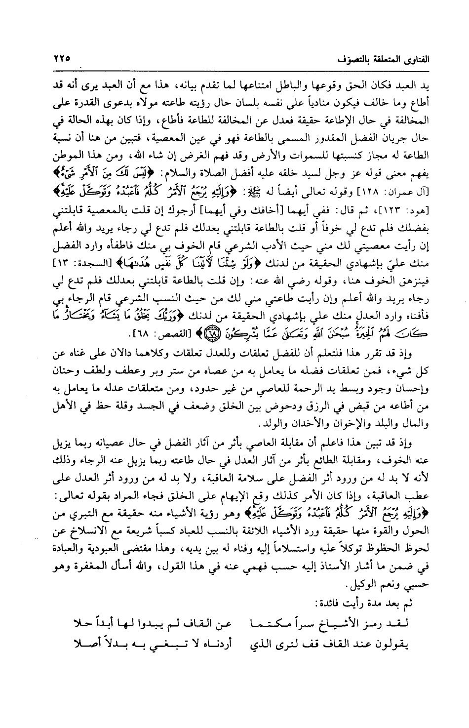 وإذ قد تبين هذا فاعلم أن مقابلة العاصي بأثر من آثار الفضل في حال عصيانه بما يزيل عنه الخوف ، ومقابلة الطائع بأثر من آثار العدل في حال طاعته ربما يزيل عنه الرجاء وذلك لأنه لا بد له من ورود أثر الفضل على سلامة العاقبة ، ولا بد له من ورود أثر العدل على عطب العاقبة ، وإذا كان الأمر كذلك وقع الإيهام على الخلق فجاء المراد بقوله تعالى : ) وإليه يرجع الأمر كله فاعبده وتوكل عليه ( وهو رؤية الأشياء منه حقيقة مع التبري من الحول والقوة منها حقيقة ورد الأشياء اللائقة بالنسب للعباد كسباً شريعة مع الانسلاخ عن لحوظ الحظوظ توكلاً عليه واستسلاماً إليه وفناءً له بين يديه ، وهذا مقتضى العبودية والعبادة في ضمن ما أشار الأستاذ إليه حسب فهمي عنه في هذا القول ، والله أسأل المغفرة وهو حسبي ونعم الوكيل.