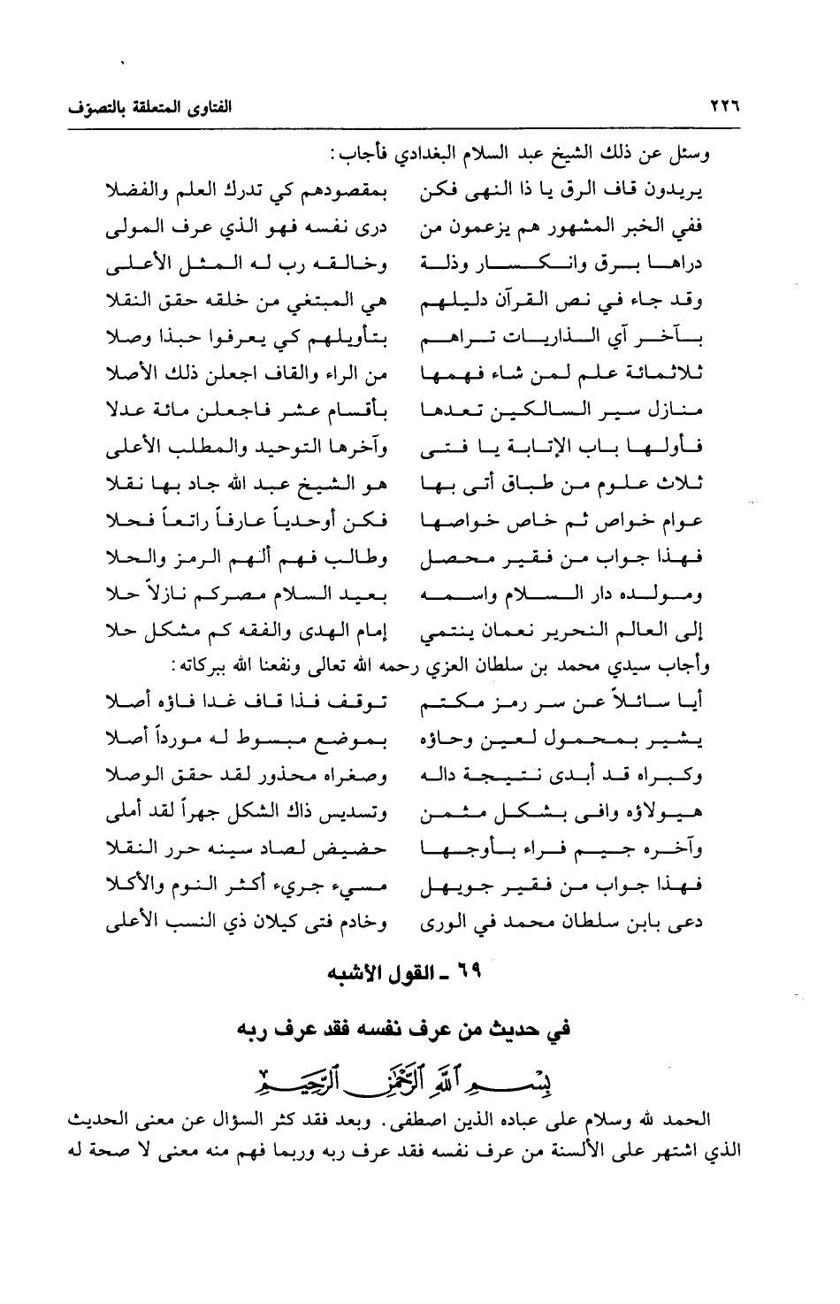 وأجاب سيدي محمد بن سلطان العزي رحمه الله تعالى ونفعنا الله ببركاته: