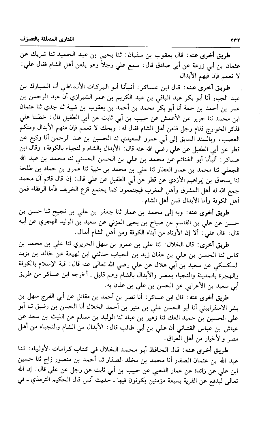 طريق أخرى عنه: قال ابن عساكر: أنبأنا أبو البركات الأنماطي أنا المبارك بن عبد الجبار أنا أبو بكر عبد الباقي بن عبد الكريم بن عمر الشيرازي أن عبد الرحمن بن عمر بن أحمد بن حمة أنا أبو بكر محمد بن أحمد بن يعقوب بن شيبة ثنا جدي ثنا عثمان ابن محمد ثنا جرير عن الأعمش عن حبيب بن أبي ثابت عن أبي الطفيل قال: خطبنا علي فذكر الخوارج فقام رجل فلعن أهل الشام فقال له: ويحك لا نعمم فإن منهم الأبدال ومنكم العصب، وبالسند السابق إلى أبي عمرو السعيدي ثنا الحسين بن عبد الرحمن أنا وكيع عن فطر عن أبي الطفيل عن علي رضي الله عنه قال: الأبدال بالشام والنجباء بالكوفة، وقال ابن عساكر: أنبأنا أبو الغنائم عن محمد بن علي بن الحسن الحسني ثنا محمد بن عبد الله الجعفي ثنا محمد بن عمار العطار ثنا علي بن محمد بن خبية ثنا عمرو ابن حماد بن طلحة ثنا إسحاق بن إبراهيم الأزدي عن قطر عن أبي الطفيل عن علي قال: إذا قال قائم آل محمد جمع الله له أهل المشرق وأهل المغرب فيجتمعون كما يجتمع قزع الخريف فأما الرفقاء فمن أهل الكوفة وأما الأبدال فمن أهل الشام.