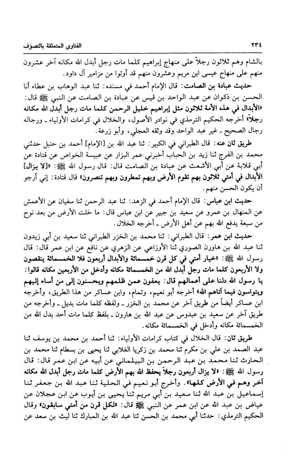 طريق ثان: قال الخلال في كتاب كرامات الأولياء: ثنا أحمد بن محمد بن يوسف ثنا عبد الصمد بن علي بن مكرم ثنا محمد بن زكريا الغلابي ثنا يحيى بن بسطام ثنا محمد ابن الحارث ثنا محمد بن عبد الرحمن بن البيلماني عن أبيه عن ابن عمر قال: قال رسول الله صلى الله عليه وسلّم: (لا يزال أربعون رجلاً يحفظ الله بهم الأرض كلمات مات رجل أبدل الله مكانه آخر وهم في الأرض كلها). وأخرج أبو نعيم في الحلية ثنا عبد الله بن جعفر ثنا إسماعيل بن عبد الله ثنا سعيد بن أبي مريم ثنا يحيى بن أيوب عن ابن عجلان عن عياض بن عبد الله عن ابن عمر عن النبي صلى الله عليه وسلّم قال: (لكل قرن من أمتي سابقون) وقال الحكيم الترمذي: حدثنا أبي محمد بن الحسن ثنا عبد الله بن المبارك ثنا ليث بن سعد عن
