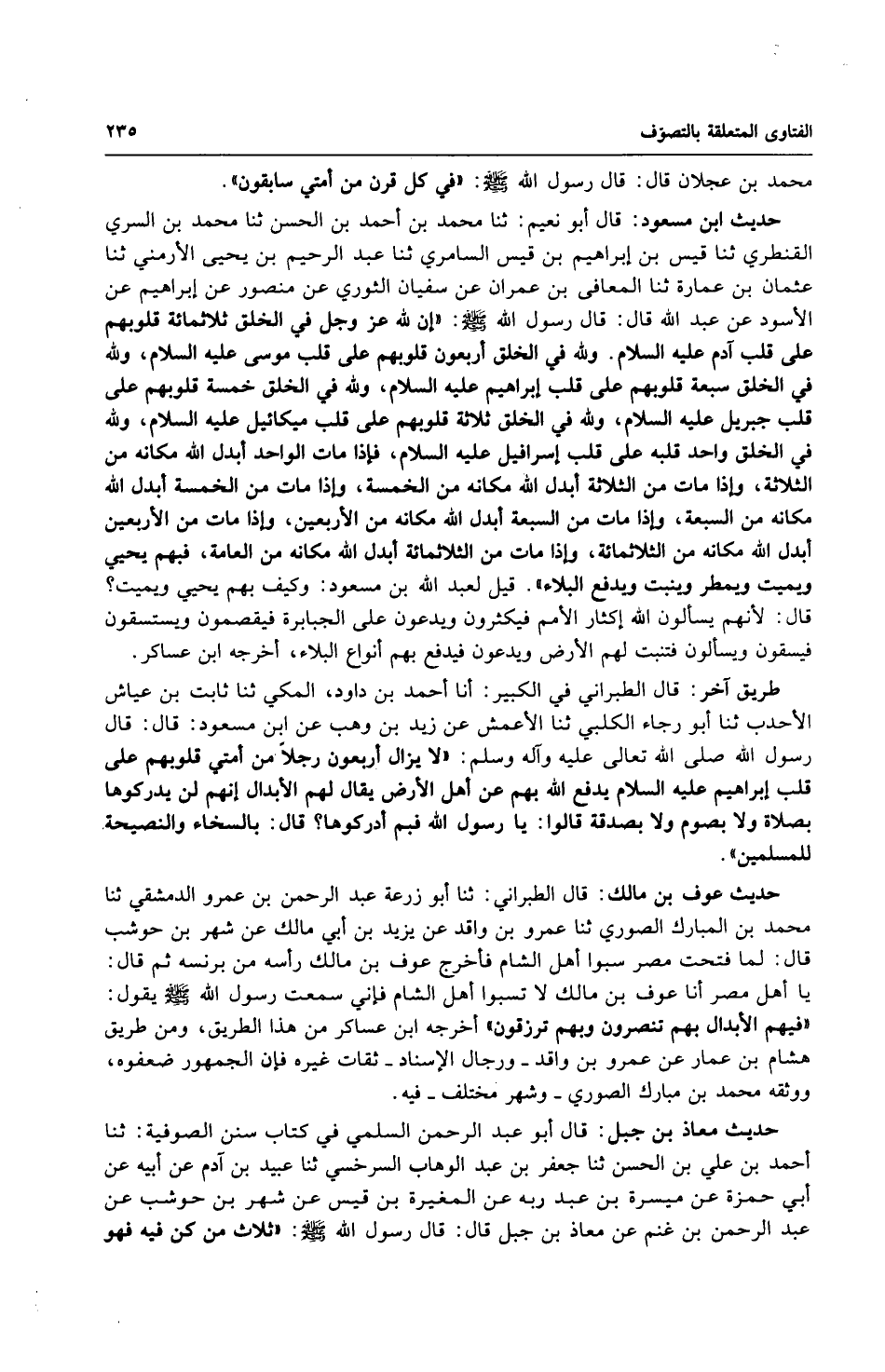 حديث ابن مسعود: قال أبو نعيم: ثنا محمد بن أحمد بن الحسن ثنا محمد بن السري القنطري ثنا قيس بن إبراهيم بن قيس السامري ثنا عبد الرحيم بن يحيى الأرمني ثنا عثمان بن عمارة ثنا المعافى بن عمران عن سفيان الثوري عن منصور عن إبراهيم عن الأسود عن عبد الله قال: قال رسول الله صلى الله عليه وسلّم: (إن لله عز وجل في الخلق ثلاثمائة قلبهم على قلب آدم عليه السلام. ولله في الخلق أربعون قلوبهم علي قلب موسى عليه السلام، ولله في الخلق سبعة قلوبهم على قلب إبراهيم عليه السلام، ولله في الخلق خمسة قلوبهم على قلب جبريل عليه السلام، ولله في الخلق ثلاثة قلوبهم على قلب ميكائيل عليه السلام، ولله في الخلق واحد قلبه على قلب إسرائيل عليه السلام، فإذا مات الواحد أبدل الله مكانه من الثلاثة، وإذا مات من الثلاثة أبدل الله مكانه من الخمسة، وإذا مات من الخمسة أبدل الله مكانه من السبعة، وإذا مات من السبعة أبدل الله مكانه من الأربعين، وإذا مات من الأربعين أبدل الله مكانه من الثلاثمائة، وإذا مات من الثلاثمائة أبدل الله مكانه من العامة، فبهم يحيي ويميت ويمطر وينبت ويدفع البلاء). قيل لعبد الله بن مسعود: وكيف بهم يحيي ويميت؟ قال: لأنهم يسألون الله إكثار الأمم فيكثرون ويدعون على الجبابرة فيقصمون ويستسقون فيسقون ويسألون فتنبت لهم الأرض ويدعون فيدفع بهم أنواع البلاء، أخرجه ابن عساكر.