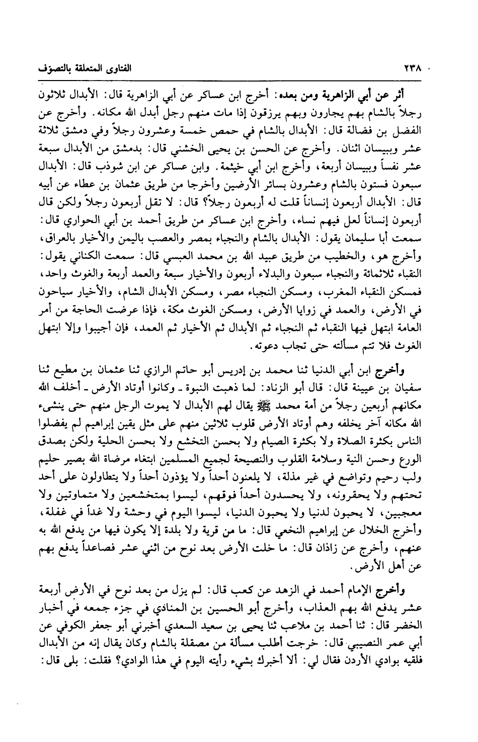 أثر عن أبي الزاهرية ومن بعده : أخرج ابن عساكر عن أبي الزاهرية قال : الأبدال ثلاثون رجلاً بالشام بهم يجارون وبهم يرزقون إذا مات منهم رجل أبدل الله مكانه. وأخرج عن الفضل بن فضالة قال : الأبدال بالشام في حمص خمسة وعشرون رجلاً وفي دمشق ثلاثة عشر وببيسان اثنان. وأخرج عن الحسن بن يحيى الخشني قال : بدمشق من الأبدال سبعة عشر نفساً وببيسان أربعة ، وأخرج ابن أبي خيثمة. وابن عساكر عن ابن شوذب قال : الأبدال سبعون فستون بالشام وعشرون بسائر الأرضين وأخرجا من طريق عثمان بن عطاء عن أبيه قال : الأبدال أربعون إنساناً قلت له أربعون رجلاً ؟ قال : لا تقل أربعون رجلاً ولكن قال أربعون إنساناً لعل فيهم نساء ، وأخرج ابن عساكر من طريق أحمد بن أبي الحواري قال : سمعت أبا سليمان يقول : الأبدال بالشام والنجباء بمصر والعصب باليمن والأخيار بالعراق ، وأخرج هو ، والخطيب من طريق عبيد الله بن محمد العبسي قال : سمعت الكناني يقول : النقباء ثلاثمائة والنجباء سبعون والبدلاء أربعون والأخيار سبعة والعمد أربعة والغوث واحد ، فمسكن النقباء المغرب ، ومسكن النجباء مصر ، ومسكن الأبدال الشام ، والأخيار سياحون في الأرض ، والعمد في زوايا الأرض ، ومسكن الغوث مكة ، فإذا عرضت الحاجة من أمر العامة ابتهل فيها النقباء ثم النجباء ثم الأبدال ثم الأخيار ثم العمد ، فإن أجيبوا وإلا ابتهل الغوث فلا تتم مسألته حتى تجاب دعوته.