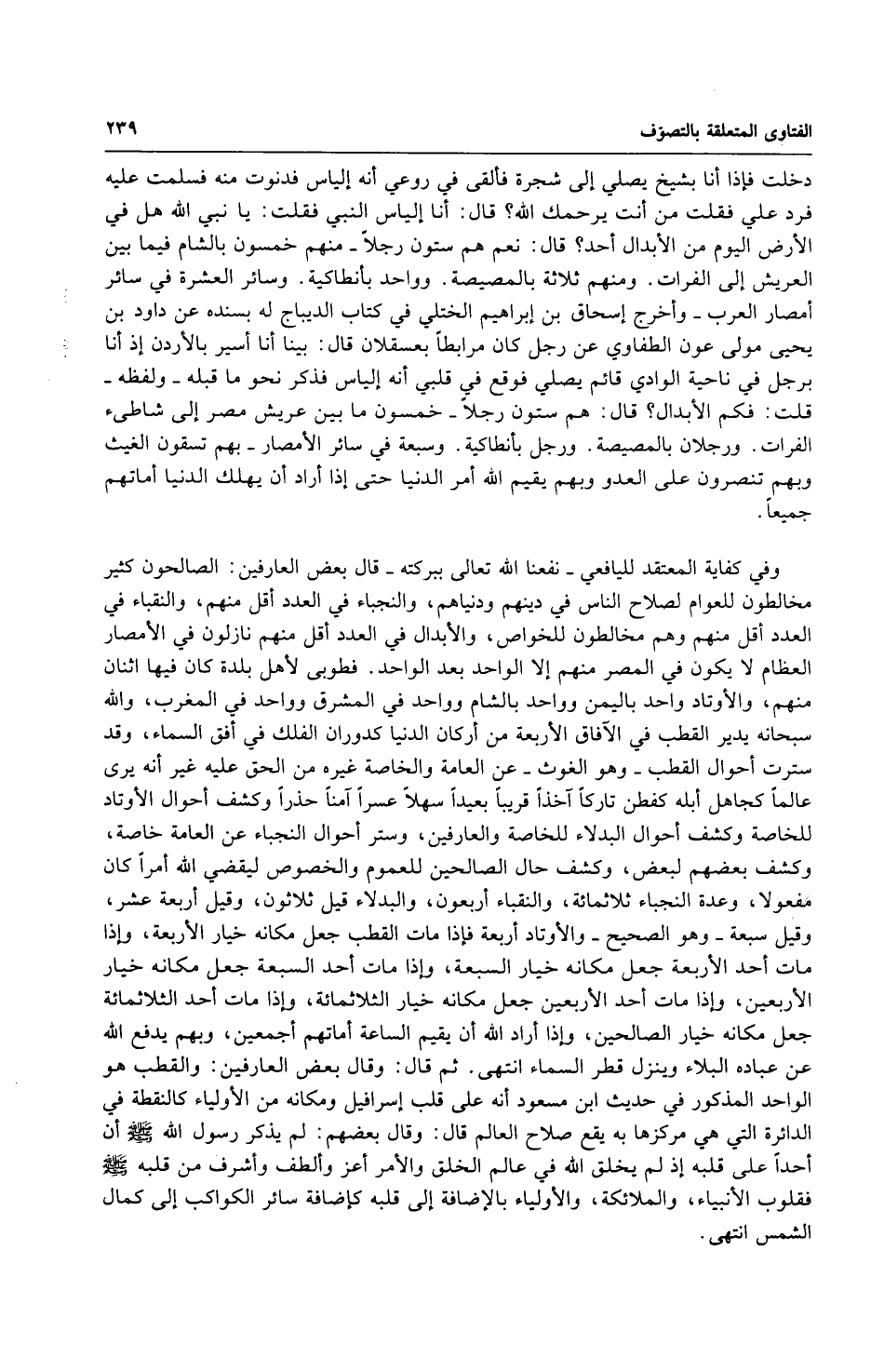 وفي كفاية المعتقد لليافعي نفعنا الله تعالى ببركته قال بعض العارفين: الصالحون كثير مخالطون للعوام لصلاح الناس في دينهم ودنياهم، والنجباء في العدد أقل منهم، والنقباء في العدد أقل منهم وهم مخالطون للخواص، والأبدال في العدد أقل منهم نازلون في الأمصار العظام لا يكون في المصر منهم إلا الواحد بعد الواحد. فطوبى لأهل بلدة كان فيها اثنان منهم، والأوتاد واحد باليمن وواحد بالشام وواحد في المشرق وواحد في المغرب، والله سبحانه يدير القطب في الآفاق الأربعة من أركان الدنيا كدوران الفلك في أفق السماء، وقد سترت أحوال القطب وهو الغوث عن العامة والخاصة غيره من الحق عليه غير أنه يرى عالماً كجاهل أبله كفطن تاركاً آخذاً قريباً بعيداً سهلاً عسراً آمناً حذراً وكشف أحوال الأوتاد للخاصة وكشف أحوال البدلاء للخاصة والعارفين، وستر أحوال النجباء عن العامة خاصة، وكشف بعضهم لبعض، وكشف حال الصالحين للعموم والخصوص ليقضي الله أمراً كان مفعولا، وعدة النجباء ثلاثمائة، والنقباء أربعون، والبدلاء قيل ثلاثون، وقيل أربعة عشر، وقيل سبعة وهو الصحيح والأوتاد أربعة فإذا مات القطب جعل مكانه خيار الأربعة، وإذا مات أحد الأربعة جعل مكانه خيار السبعة، وإذا مات أحد السبعة جعل مكانه خيار الأربعين، وإذا مات أحد الأربعين جعل مكانه خيار الثلاثمائة، وإذا مات أحد الثلاثمائة جعل مكانه خيار الصالحين، وإذا أراد الله أن يقيم الساعة أماتهم أجمعين، وبهم يدفع الله عن عباده البلاء وينزل قطر السماء انتهى. ثم قال: وقال بعض العارفين: والقطب هو الواحد المذكور في حديث ابن مسعود أنه على قلب إسرافيل ومكانه من الأولياء كالنقطة في الدائرة التي هي مركزها به يقع صلاح العالم قال: وقال بعضهم: لم يذكر رسول الله صلى الله عليه وسلّم أن أحداً على قلبه إذ لم يخلق الله في عالم الخلق والأمر أعز وألطف وأشرف من قلبه صلى الله عليه وسلّم فقلوب الأنبياء، والملائكة، والأولياء بالإضافة إلى قلبه كإضافة سائر الكواكب إلى كمال الشمس انتهى.