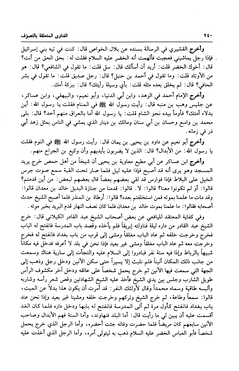 وأخرج القشيري في الرسالة بسنده عن بلال الخواص قال: كنت في تيه بين إسرائيل فإذا رجل يماشيني فعجبت فألهمت أنه الخضر عليه السلام فقلت له: بحق الحق من أنت؟ قال: أخوك الخضر قلت: أريد أن أسألك قال: سل قلت: ما تقول في الشافعي؟ قال: هو من الأوتاد قلت: وما تقول في أحمد بن حنبل؟ قال: رجل صديق قلت: ما تقول في بشر الحافي؟ قال: لم يخلق بعده مثله قلت: بأي وسيلة رأيتك؟ قال: ببركة أمك.