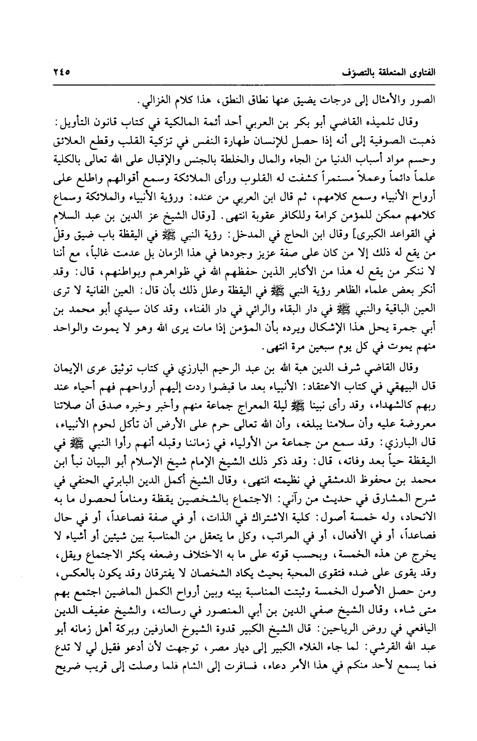 وقال القاضي شرف الدين هبة الله بن عبد الرحيم البارزي في كتاب توثيق عرى الإيمان قال البيهقي في كتاب الإعتقاد: الأنبياء بعد ما قبضوا ردت إليهم أرواحهم فهم أحياء عند ربهم كالشهداء، وقد رأى نبينا صلى الله عليه وسلّم ليلة المعراج جماعة منهم وأخبر وخبره صدق أن صلاتنا معروضة عليه وأن سلامنا يبلغه، وأن الله تعالى حرم على الأرض أن تأكل لحوم الأنبياء، قال البارزي: وقد سمع من جماعة من الأولياء في زماننا وقبله أنهم رأوا النبي صلى الله عليه وسلّم في اليقظة حياً بعد وفاته، قال: وقد ذكر ذلك الشيخ الإمام شيخ الإسلام أبو البيان نبأ ابن محمد بن محفوظ الدمشقي في نظيمته انتهى، وقال الشيخ أكمل الدين البابرتي الحنفي في شرح المشارق في حديث من رآني: الاجتماع بالشخصين يقظة ومناماً لحصول ما به الإتحاد، وله خمسة أصول: كلية الاشتراك في الذات، أو في صفة فصاعداً، أو في حال فصاعداً، أو في الأفعال، أو في المراتب، وكل ما يتعقل من المناسبة بين شيئين أو أشياء لا يخرج عن هذه الخمسة، وبحسب قوته على ما به الاختلاف وضعفه يكثر الاجتماع ويقل، وقد يقوى على ضده فتقوى المحبة بحيث يكاد الشخصان لا يفترقان وقد يكون بالعكس، ومن حصل الأصول الخمسة وثبتت المناسبة بينه وبين أرواح الكمل الماضين اجتمع بهم متى شاء، وقال الشيخ صفي الدين بن أبي المنصور في رسالته، والشيخ عفيف الدين اليافعي في روض الرياحين: قال الشيخ الكبير قدوة الشيوخ العارفين وبركة أهل زمانه أبو عبد الله القرشي: لما جاء الغلاء الكبير إلى ديار مصر، توجهت لأن أدعو فقيل لي لا تدع فما يسمع لأحد منكم في هذا الأمر دعاء، فسافرت إلى الشام فلما وصلت إلى قريب ضريح
