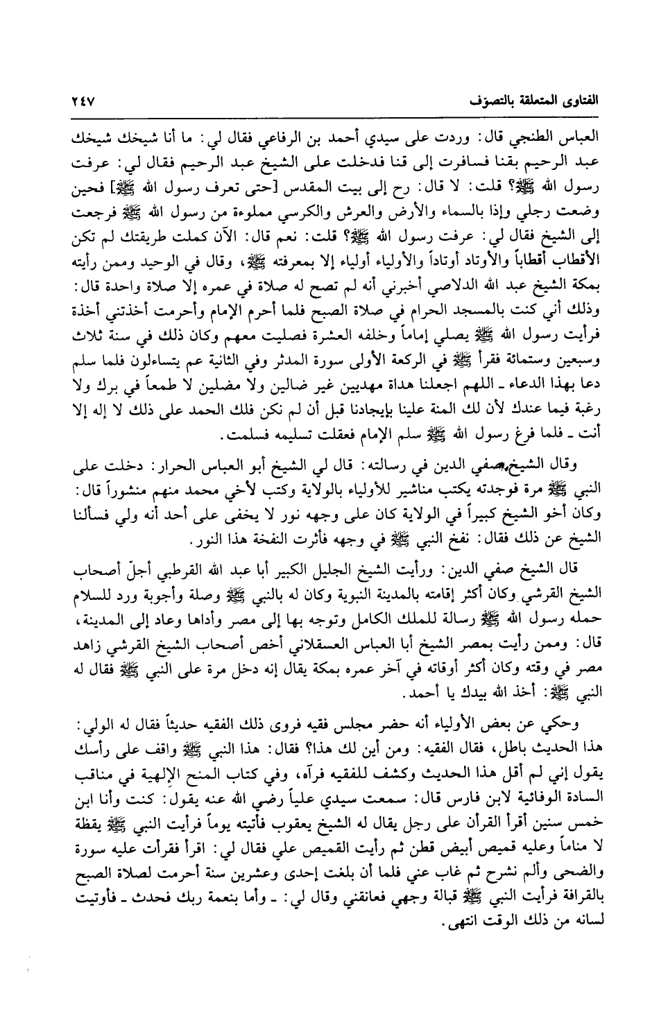 العباس الطنجي قال: وردت على سيدي أحمد بن الرفاعي فقال لي: ما أنا شيخك شيخك عبد الرحيم بقنا فسافرت إلى قنا فدخلت على الشيخ عبد الرحيم فقال لي: عرفت رسول الله صلى الله عليه وسلّم؟ قلت: لا قال: رح إلى بيت المقدس [حتى تعرف رسول الله صلى الله عليه وسلّم] فحين وضعت رجلي وإذا بالسماء والأرض والعرش والكرسي مملوءة من رسول الله صلى الله عليه وسلّم فرجعت إلى الشيخ فقال لي: عرفت رسول الله صلى الله عليه وسلّم؟ قلت: نعم قال: الآن كملت طريقتك لم تكن الأقطاب أقطاباً والأوتاد أوتاداً والأولياء أولياء إلا بمعرفته صلى الله عليه وسلّم، وقال في الوحيد وممن رأيته بمكة الشيخ عبد الله الدلاصي أخبرني أنه لم تصح له صلاة في عمره إلا صلاة واحدة قال: وذلك أني كنت بالمسجد الحرام في صلاة الصبح فلما أحرم الإمام وأحرمت أخذتني أخذة فرأيت رسول الله صلى الله عليه وسلّم يصلي إماماً وخلفه العشرة فصليت معهم وكان ذلك في سنة ثلاث وسبعين وستمائة فقرأ صلى الله عليه وسلّم في الركعة الأولى سورة المدثر وفي الثانية عم يتساءلون فلما سلم دعا بهذا الدعاء اللهم اجعلنا هداة مهديين غير ضالين ولا مضلين لا طمعاً في برك ولا رغبة فيما عندك لأن لك المنة علينا بإيجادنا قبل أن لم نكن فلك الحمد على ذلك لا إله إلا أنت فلما فرغ رسول الله صلى الله عليه وسلّم سلم الإمام فعقلت تسليمه فسلمت.