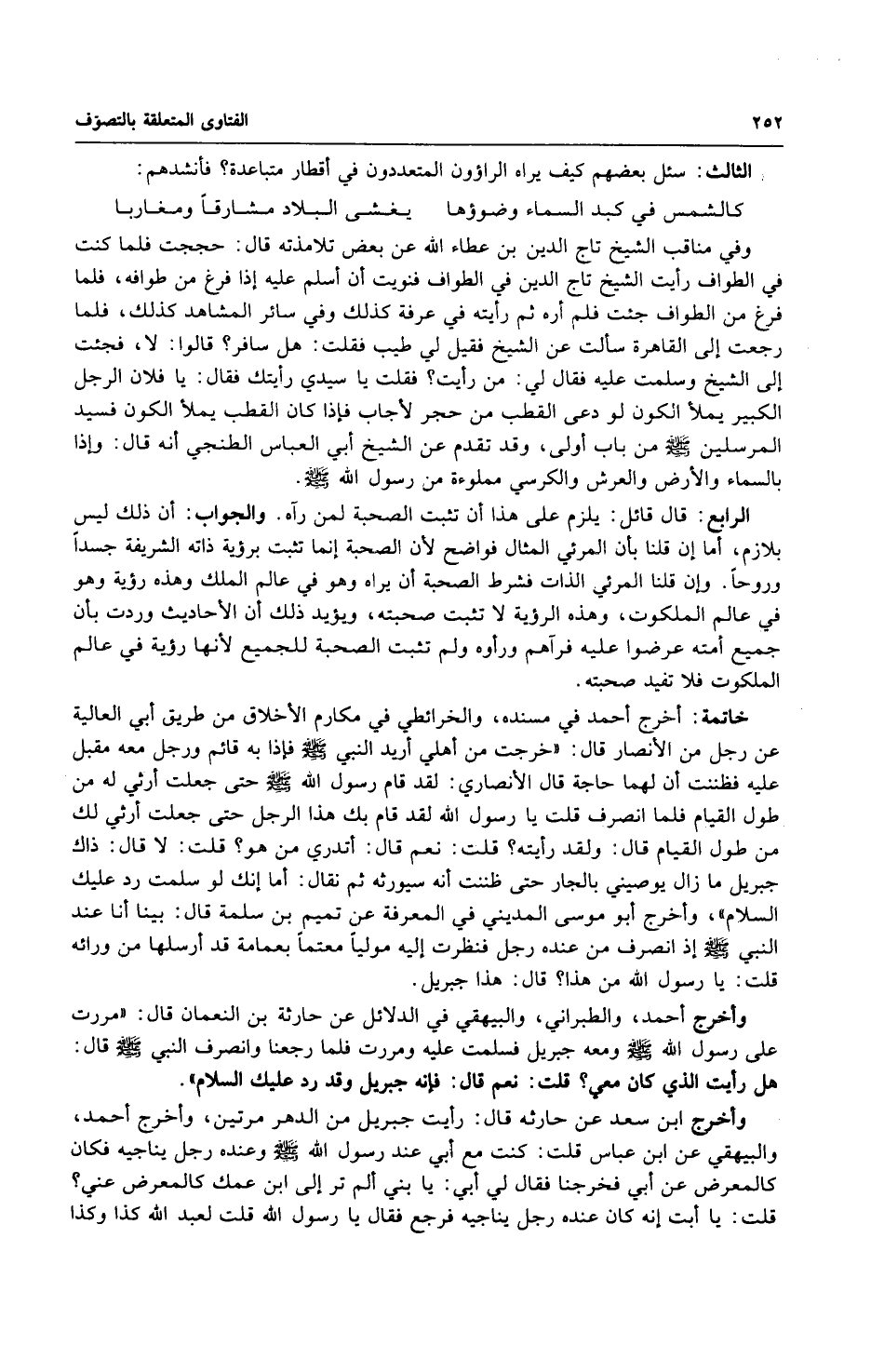 الرابع: قال قائل: يلزم على هذا أن تثبت الصحبة لمن رآه. والجواب: أن ذلك ليس بلازم، أما إن قلنا بأن المرئي المثال فواضح لأن الصحبة إنما تثبت برؤية ذاته الشريفة جسداً وروحاً. وإن قلنا المرئي الذات فشرط الصحبة أن يراه وهو في عالم الملك وهذه رؤية وهو في عالم الملكوت، وهذه الرؤية لا تثبت صحبته، ويؤيد ذلك أن الأحاديث وردت بأن جميع أمته عرضوا عليه فرآهم ورأوه ولم تثبت الصحبة للجميع لأنها رؤية في عالم الملكوت فلا تفيد صحبته.