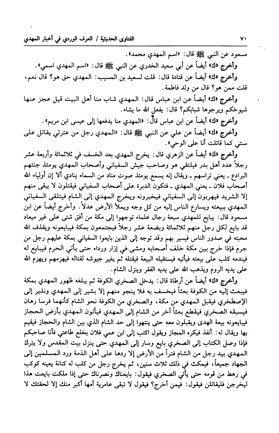 وأخرج (ك) أيضاً عن قتادة قال: قلت لسعيد بن المسيب: المهدي حق هو؟ قال نعم، قلت ممن هو؟ قال من ولد فاطمة.