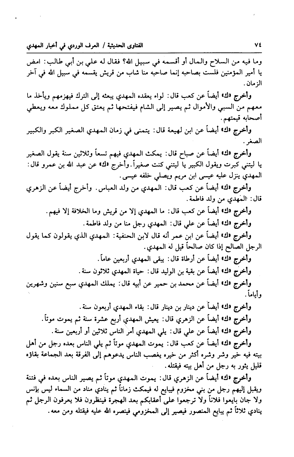 وأخرج (ك) أيضاً عن صباح قال: يمكث المهدي فيهم تسعاً وثلاثين سنة يقول الصغير يا ليتني كبرت ويقول الكبير يا ليتني كنت صغيراً. وأخرج (ك) عن عبد الله بن عمرو قال: المهدي ينزل عليه عيسى ابن مريم ويصلي خلفه عيسى.