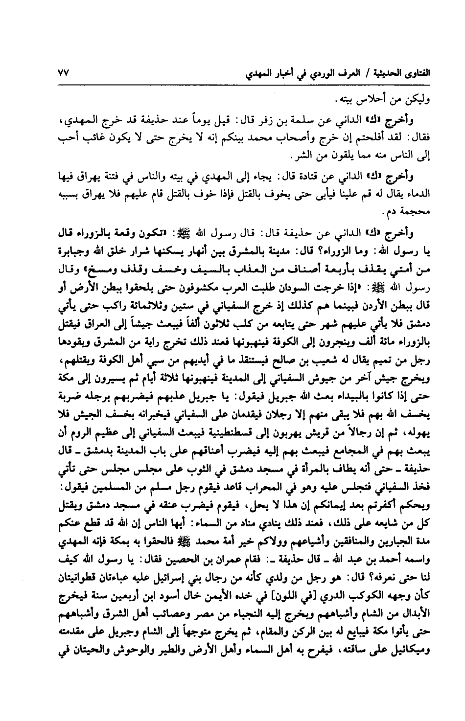 وأخرج (ك) الداني عن سلمة بن زفر قال: قيل يوماً عند حذيفة قد خرج المهدي، فقال: لقد أفلحتم إن خرج وأصحاب محمد بينكم إنه لا يخرج حتى لا يكون غائب أحب إلى الناس منه مما يلقون من الشر.